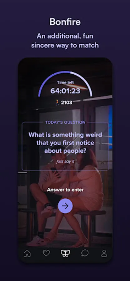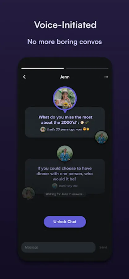 • By helping you filter people out with the use of Divisive Questions. Say if there was a hundred people in line that wants to meet you, what is one question that you would ask to filter them out? The chat is locked when you first match with someone. To unlock it, both parties have to answer each other’s Divisive Question using voice.