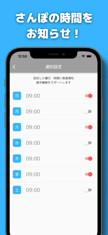 -You can set notifications for each day of the week. Where are you going for a walk today? --Push Sanpo--