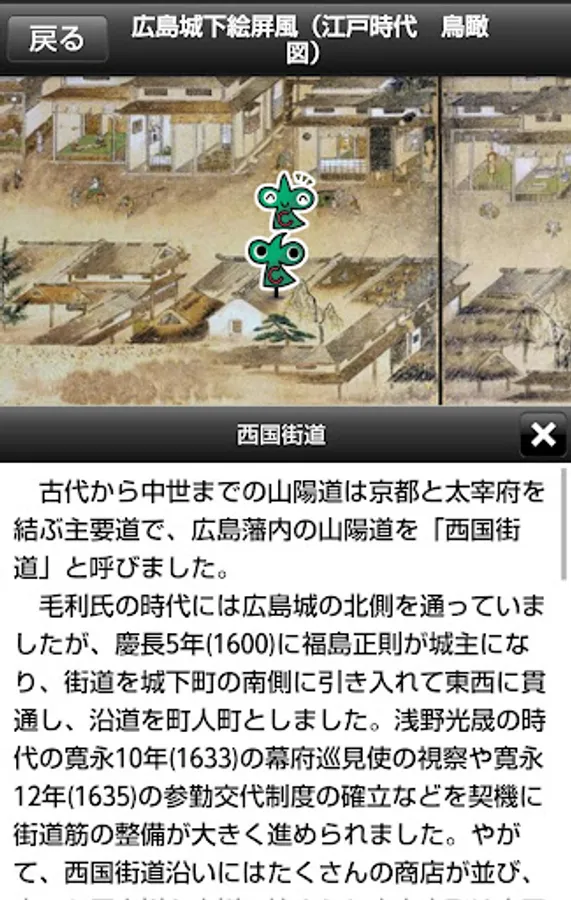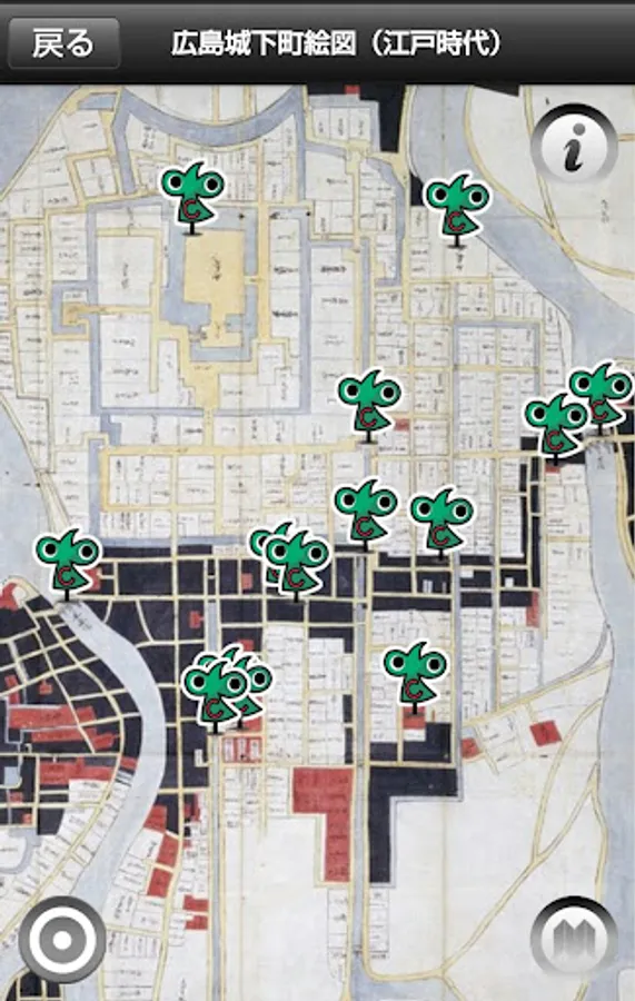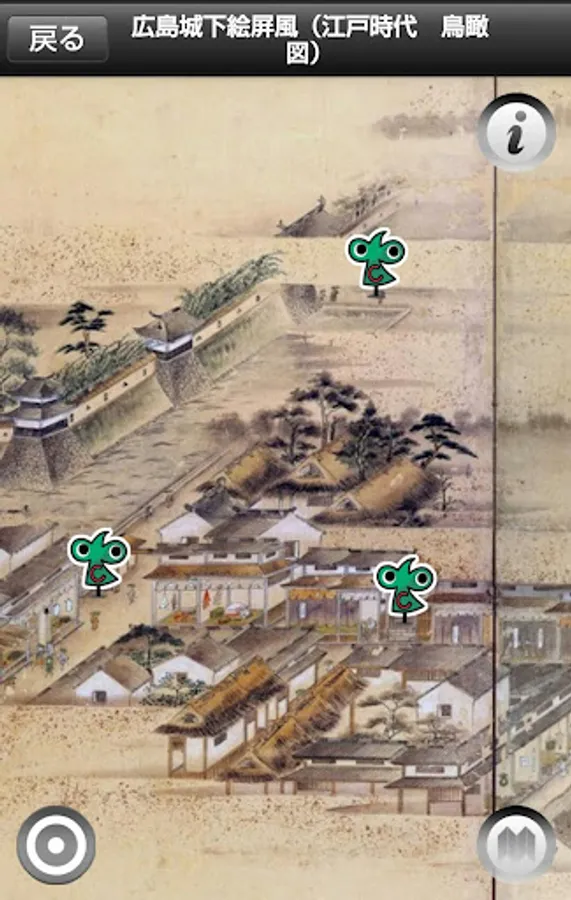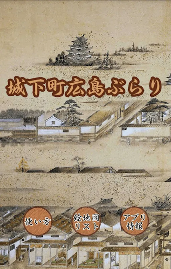 「城下町広島ぶらり」は、広島城をはじめとする広島市中心部の昔の絵地図等を現在地情報付きで見ることができるとともに、歴史的資源等の解説や写真等を確認することができる、まち歩き支援アプリです。