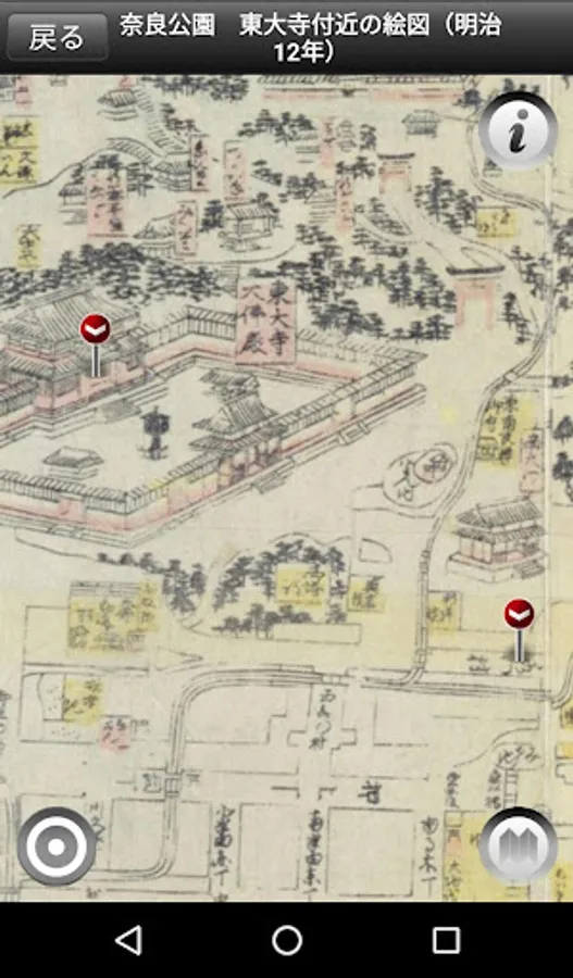 「奈良絵図紀行」では、古地図の上に現在地を表示し、標準地図と切り替えて見ることができます。