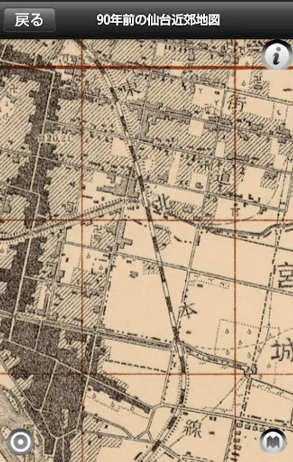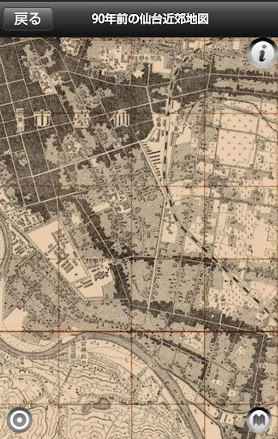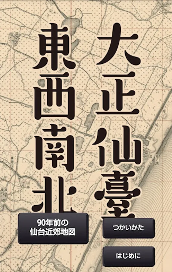 本原図は「仙臺近郊 東部」、「仙臺近郊 西部」の2枚からなりますが、アプリ製作にあたり1枚に統合することで、東は仙台市若林区荒浜、西は仙台市青葉区折立、南は仙台市太白区中田町、北は仙台市泉区七北田の各界隈を示す地図としました。