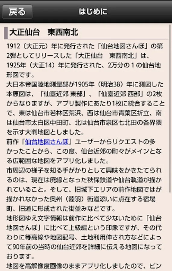 市中心部周辺の様子を知る手がかりとして、例えば、現在は廃線となった秋保鉄道や仙台軌道、また、奥州(陸羽)街道添いに点在する宿場町、旧道に形成された街並み、その他、地名や土地利用状況など、90年前の詳細な情報が盛り込まれております。前作「仙台地図さんぽ」ユーザーからもリクエストの多かった地図をお楽しみください。