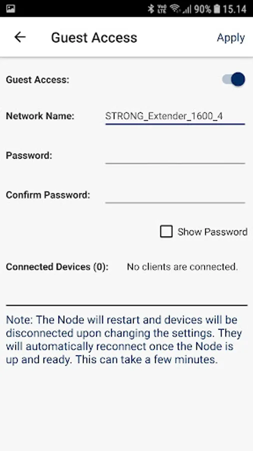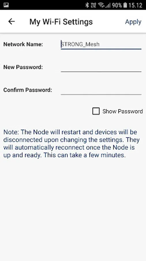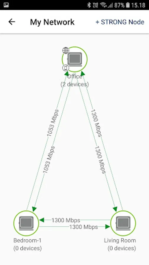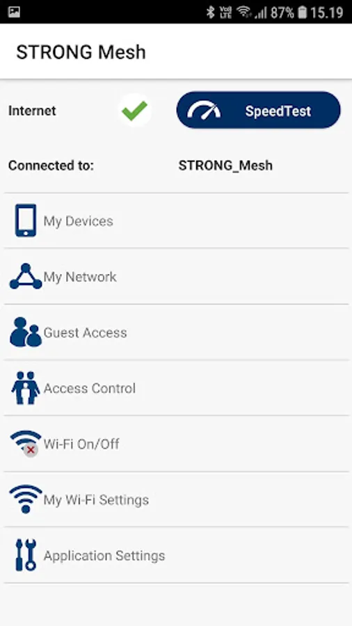 STRONG Mesh is a Wi-Fi Mesh network management and monitoring application. You will manage your Wi-Fi Mesh Network at a finger touch by blocking or allowing Internet access per device, Scheduling internet access, creating a Guest access, displaying on a Network map mesh node configurations and Wi-Fi links status. Changing Network Name and Password settings becomes a piece of cake.