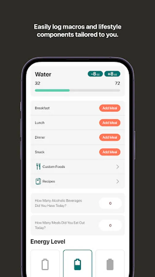 • Track specific lifestyle components such as water intake, sleep, stress, steps, exercise, and more in your customized interactive daily log