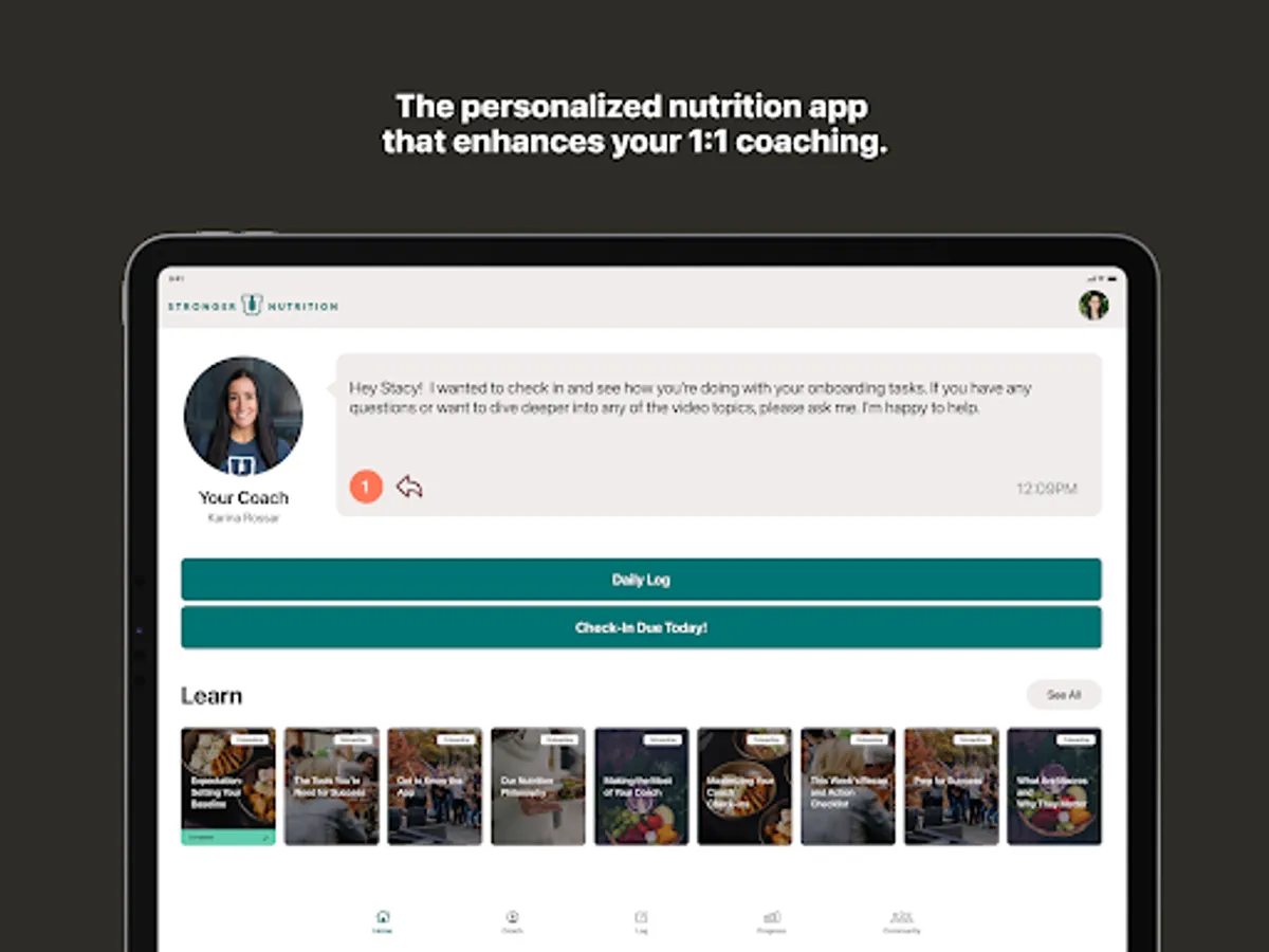The Stronger U App enhances your 1:1 coaching by giving you the tools to accelerate results. The innovative design includes a tailored-to-you interactive log, macronutrient plan, RD-verified nutrition tracker, educational resources, and unlimited coach messaging.