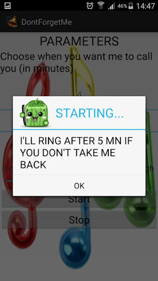 How many times have you ever let your smartphone to a place where you thought to be safe then you leave without take it with you? This little application will save you a lot of trouble. You turn on when you arrive at work, at home parents, grandparents or in your children home, or even for your little ones. Your phone will ring as if you receive a call. Impossible to forget. You can set it as needed. You can ask him to ring your phone every 5 minutes from 5 minutes to 30 minutes of inactivity. As long as he is moving on you, in your pocket or in your hand, the application detects your movements and will not ring the phone. But if you ask him and do not resume with you, it will ring and remind you as well that you forget an item dear to you like your eyes ! You enable and disable Don't Forget Me!! as needed.