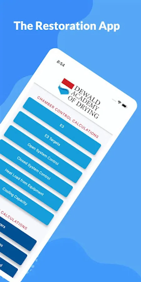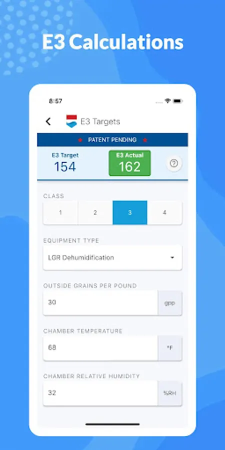 This app is built for all levels of restorers in the water mitigation industry. For the first time ever these proprietary algorithms and metrics will give the restorer complete control of their drying chamber regardless of the size, class, equipment used or outside conditions instead of the restorer being controlled by their chamber. The keystone metric for this app is the patent pending E3 metric that can evaluate the exact evaporation ability of any condition in a drying chamber and the daily E3 targets that have been set for all different types of drying equipment for all possible water classes and outside conditions. This metric also allows for all different types of equipment to be specifically ranked or compared to prove which is the best for any job scenario.