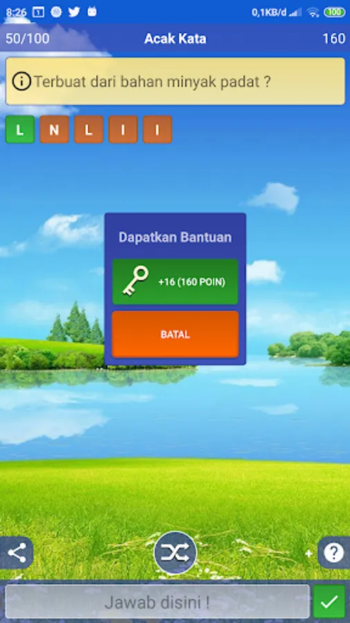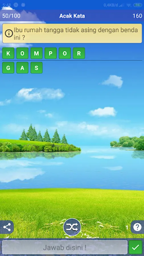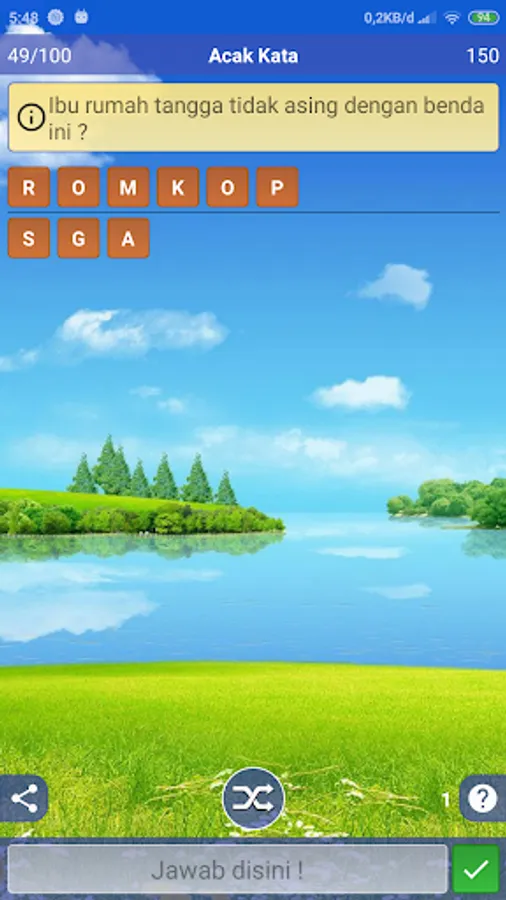 If you have difficulty answering the random word questions given, then you can use the help button. The help button can help you find the correct word order to arrange. Each time you press the help button, you will be shown a character that can arrange the random word into the word in question.