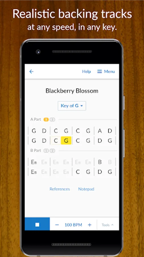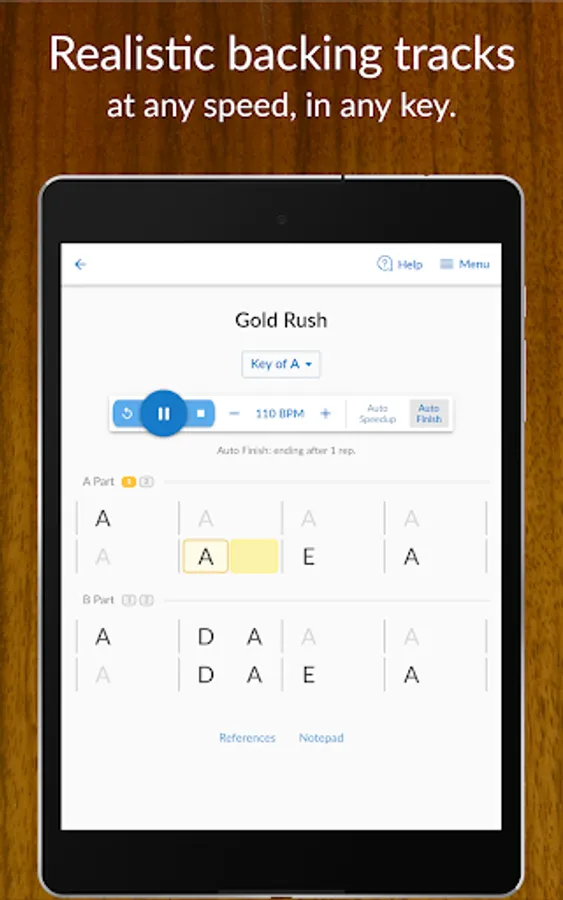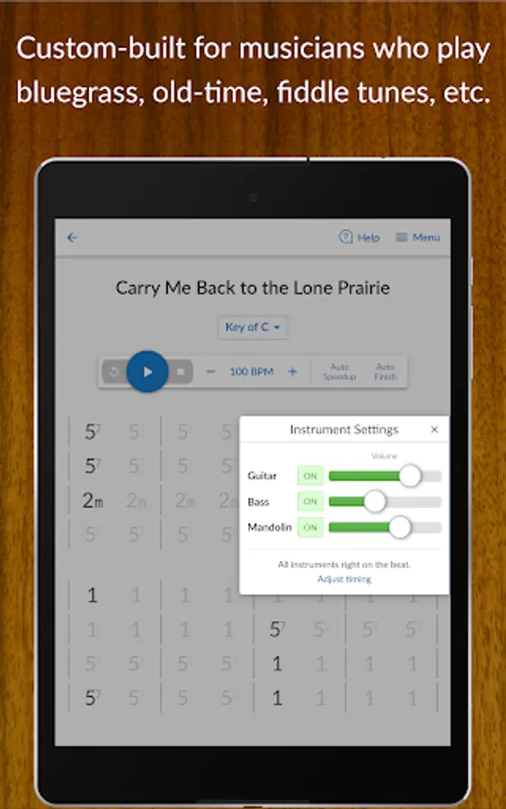 Practice all your songs with customizable backing tracks generated with audio from real instruments: guitar, mandolin, and standup bass.