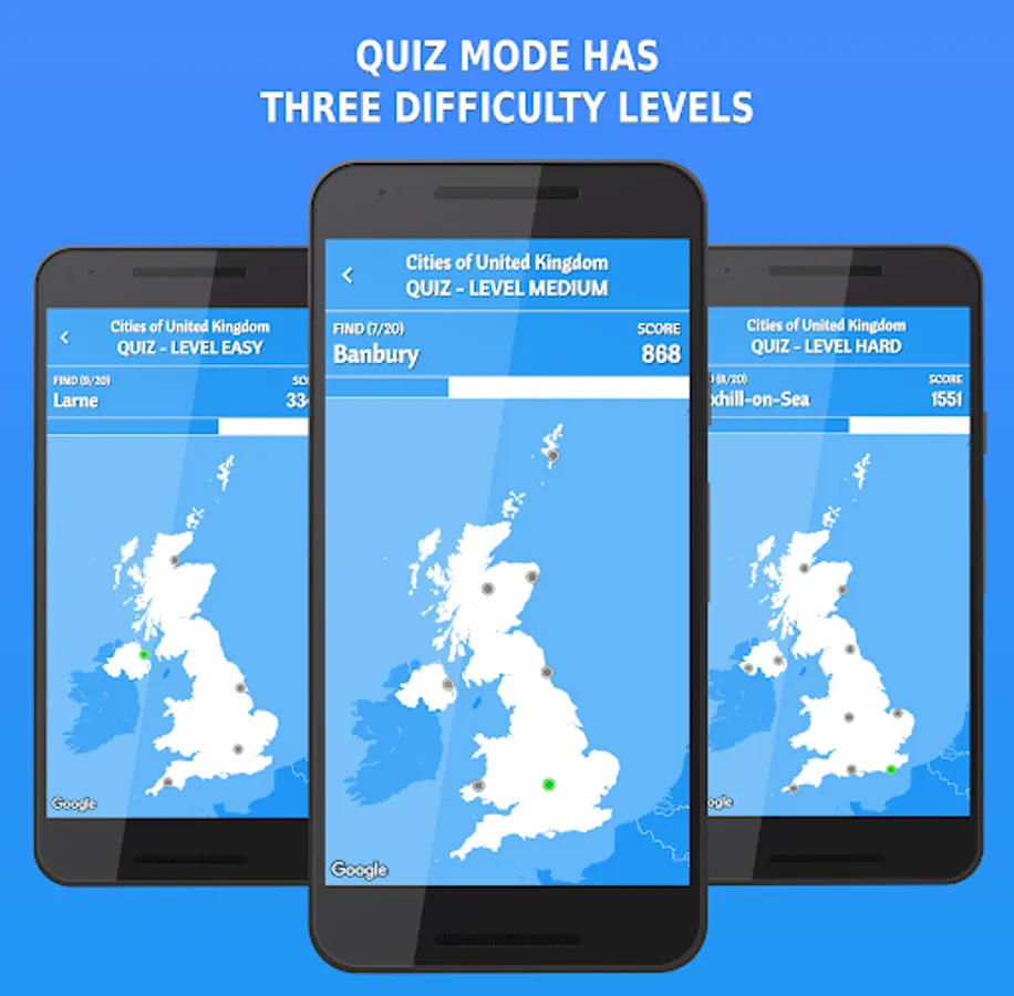 QUIZ: The goal is to guess where a city or town is on a map. You have several options to select and only one is right. Each level has a different number of possible answers. Fast (and correct) answers will be promoted by extra points.