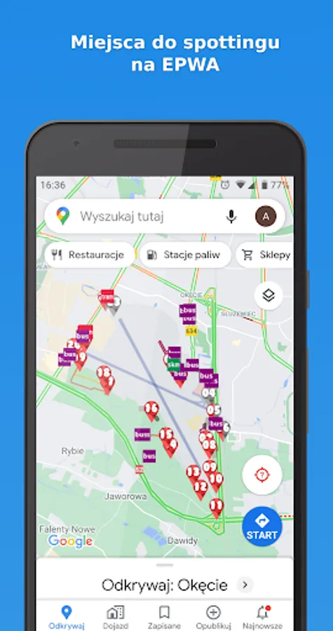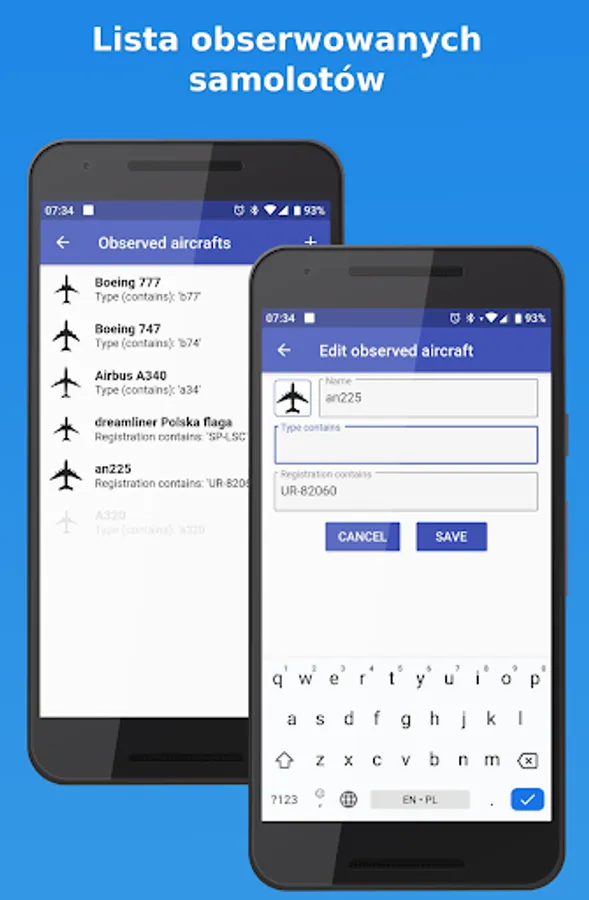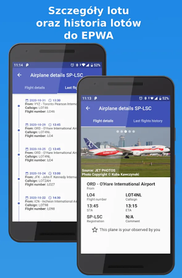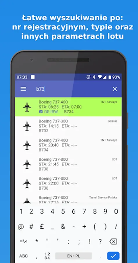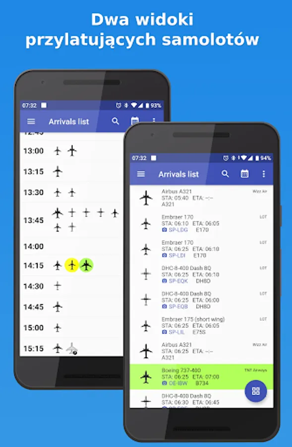 The mobile application is a visualization of the very popular spotter website www.epwa-spotters.pl. Two scheduled flight views: a list and a grouping of arrivals in 15-minute time windows