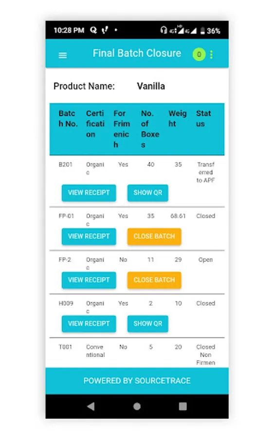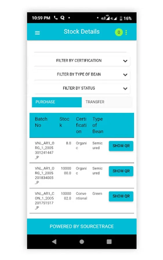 Firtraceability app is designed and developed by SourceTrace for managing any crop growers and supplier/agent network which includes procurement, warehouse management, processing and shipment to the customer. The app has been built keeping digital demand in mind with full capability of visualizing all processes/transactions at any point of time by the administrators or top management in an organization without any manual intervention. The app supports offline use of the application and aids in geo plotting and taking farm photos. It captures the activities like purchase, aggregation, processing and shipment of farmer produces to plants. It has real-time controlling and visualization of the stocks across the end to end processes from warehouses to shipments. The app is available on mobile as well as on web.