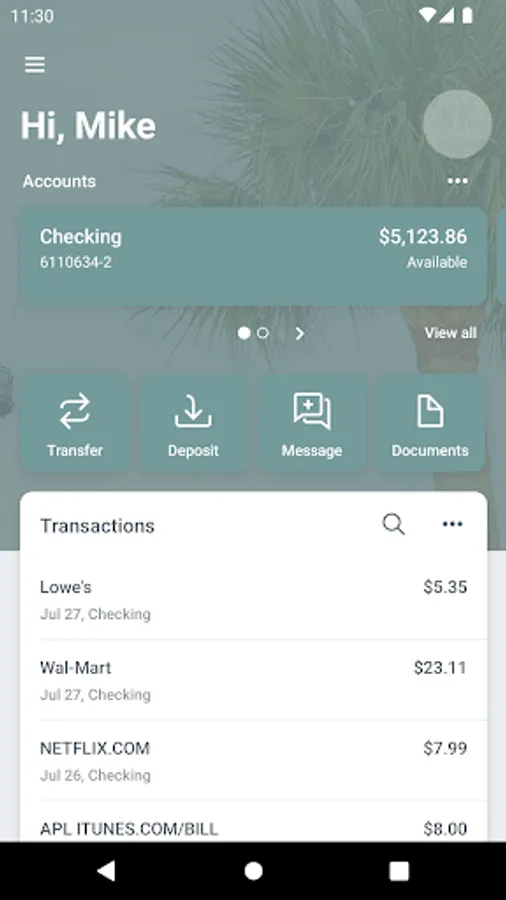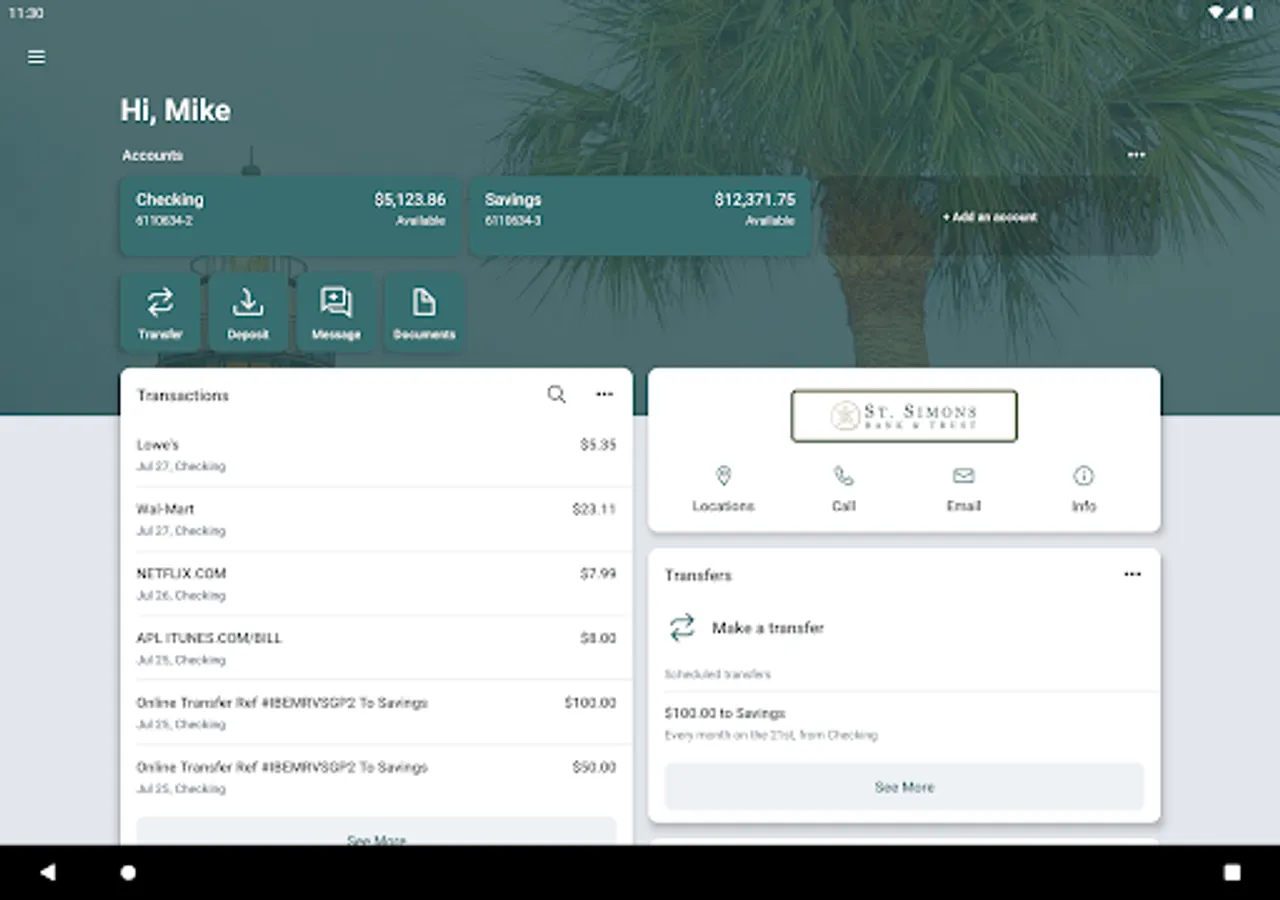 For the customer who is always on the go, this mobile banking solution brings the bank to you. St Simons Bank & Trust Mobile Banking allows you to utilize your phone to access your accounts anytime, from anywhere and at no cost. Use this FREE App to: view account balances and transaction history, view account alerts, initiate account transfers, pay bills or pay a person.