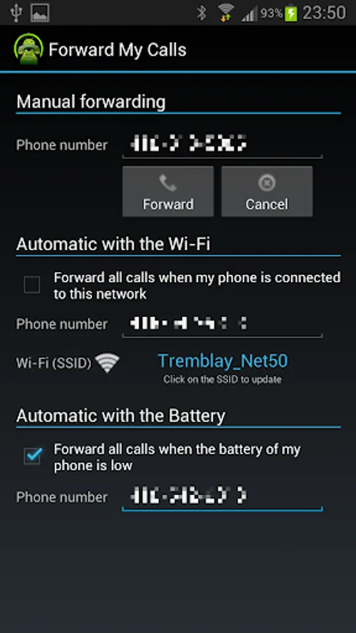 Secondly, if you want to save costs on your mobile phone or if like me you prefer to use a landline at home or at your office . This application can automatically forward your calls on your landline when the WiFi network in your home or office is detected. The transfer is automatically cancelled when you leave your home or office .