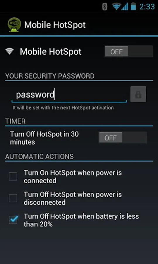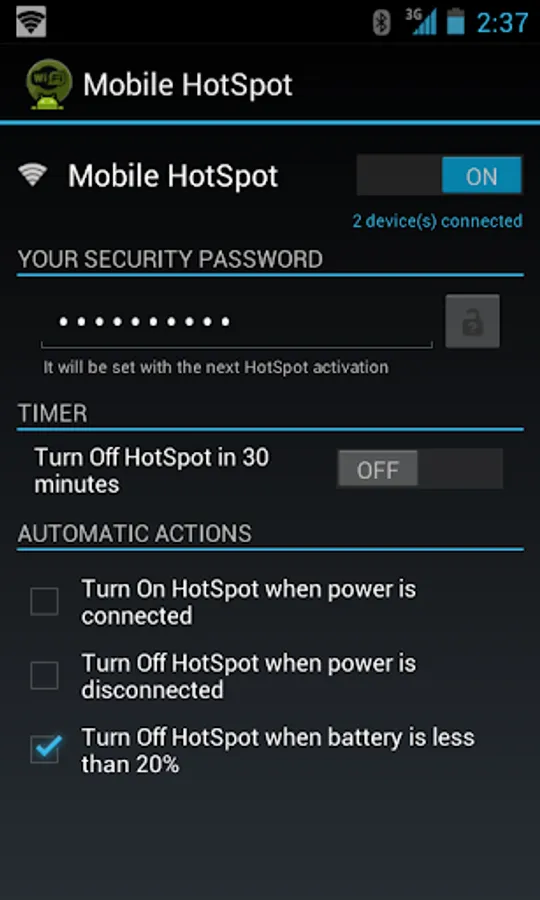 Also you can automatically activate your HotSpot as you connect your phone on AC or USB power. In the same way, as you disconnect your phone from a power source you can automatically turn off the HotSpot application.