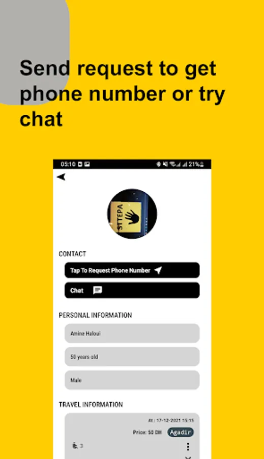 Let’s imagine i find what I’m looking for from travel or ticket, how I contact the driver or who want sell that ticket, easy way, sttepa provides two way to make contact, first one is request his phone number, and the second one is chat him directly,