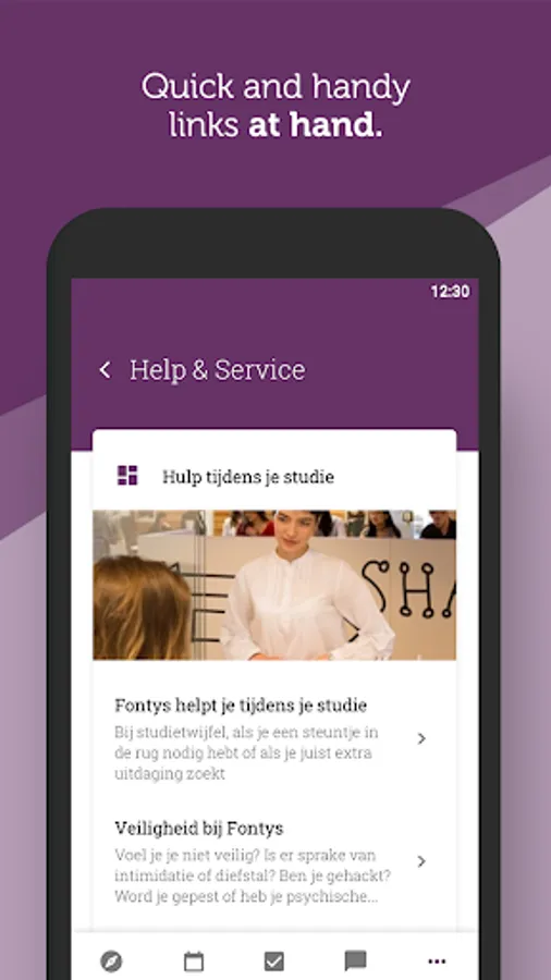 This brings all your personal information together in one app that is clear and easy to use. The MyFontys app puts you, as a student, first. This way you accelerate even more in your education.
