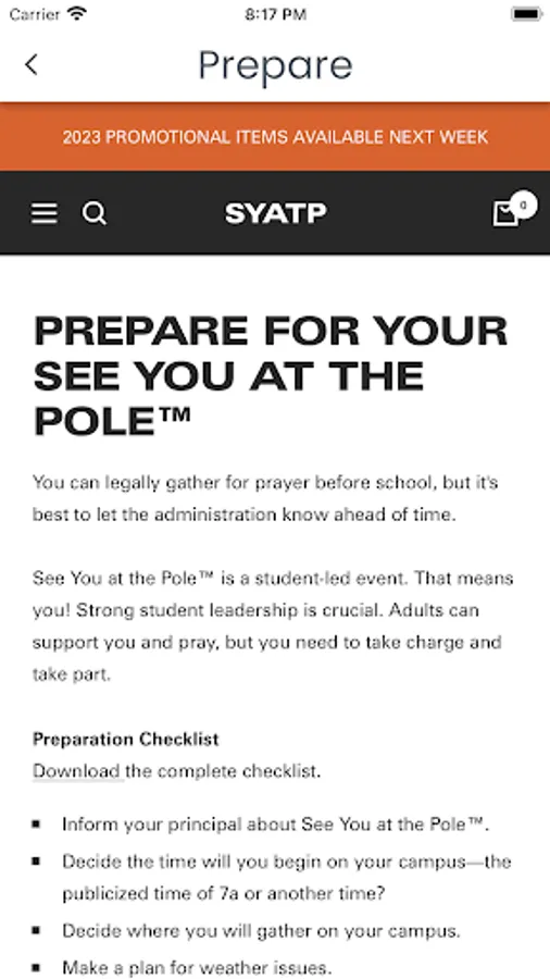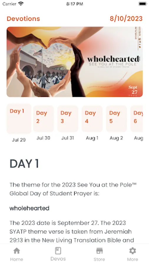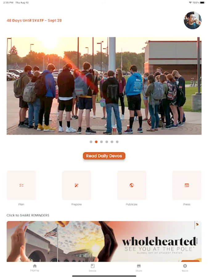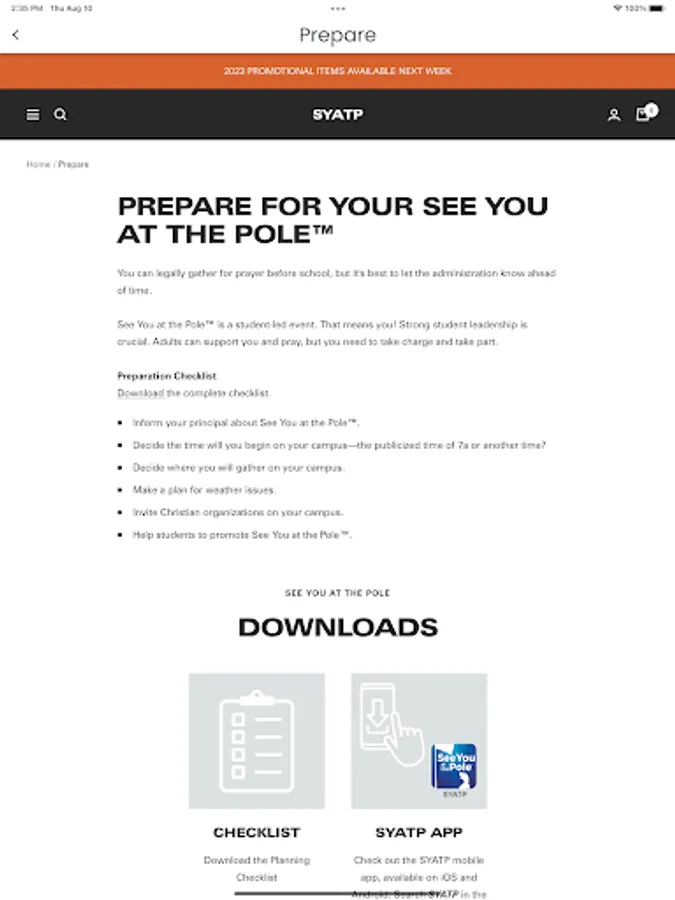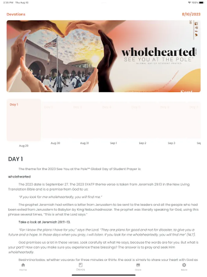 See You at the Pole™ is a global movement of prayer which is student-initiated, student-organized, and student-led. It revolves around students praying together on the fourth Wednesday in September, usually before school and usually at the school's flag pole. It involves student in elementary schools, middle/junior high schools, high schools, and colleges/universities across the globe. Adults often pray in support of the students on campus by gathering nearby, at their places of work or worship, or at city halls.