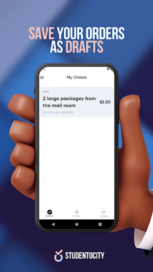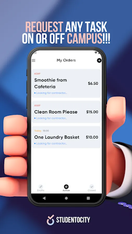 You can free up the time in your day by using STUDENTOCITY! We connect you with fellow students, who study in your college, and are willing to work on these set tasks quickly and safely. Popular tasks include local food delivery to the dorm doorstep, room cleaning, laundry service, mail pickup, and homework help, amongst others.