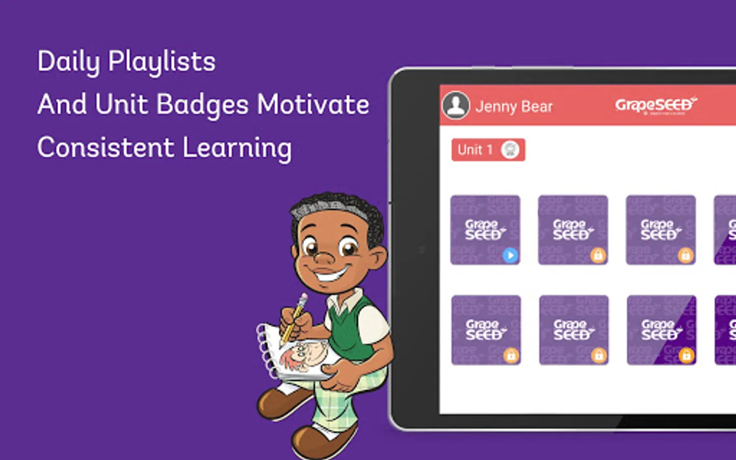 GrapeSEED students learn using interactive video playlists, daily exercises, earning badges and have a complete unit media library.