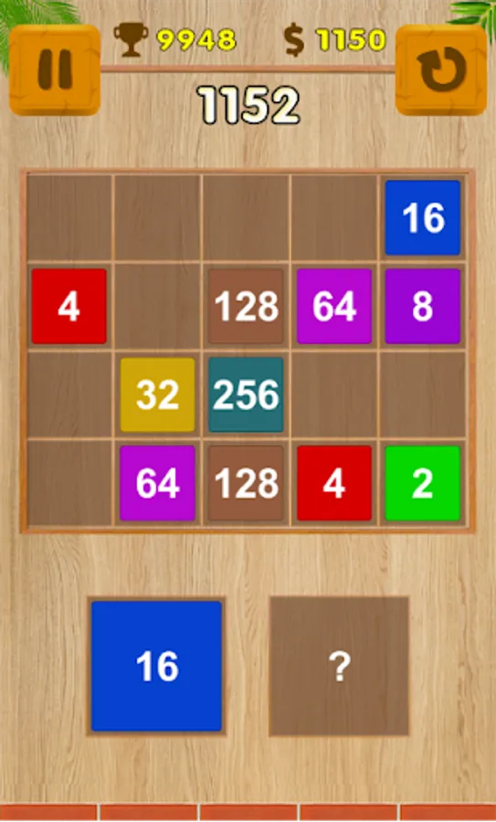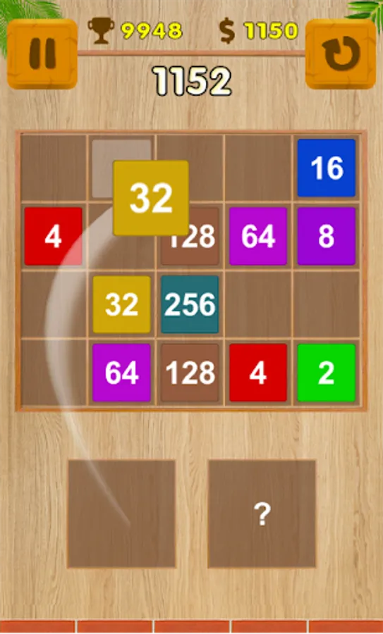 - Drag and drop number blocks to the board to merge same numbers together.