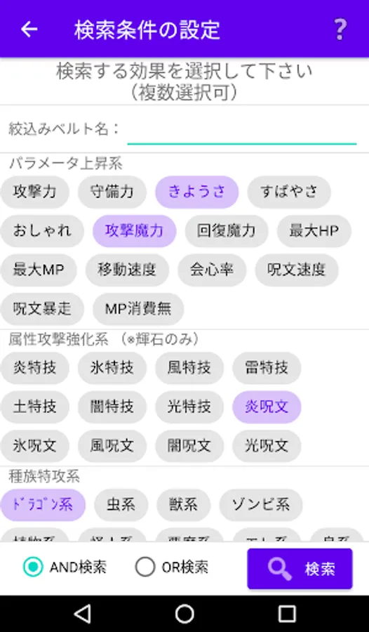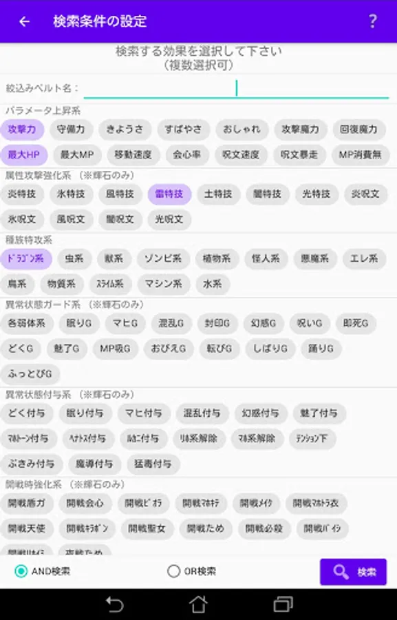 ・ Multiple effects can be specified for the search conditions (Kogeki power + dragon type, etc.), and both AND search / OR search are possible.