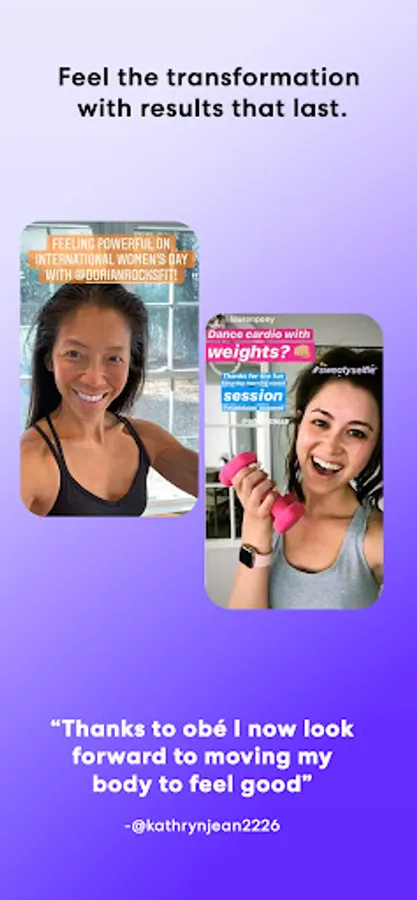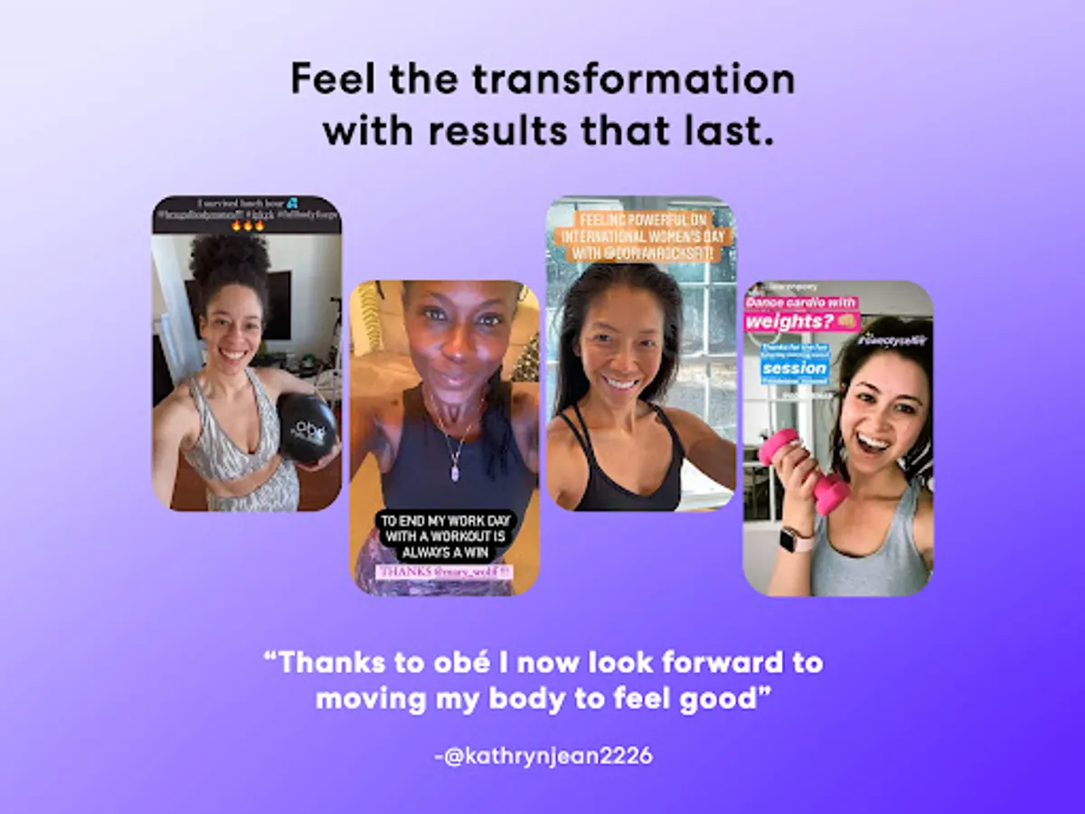 Designed for women and their unique needs, obé is built to boost your body literacy and help you fall in love with movement. Explore features like cycle syncing workouts, class suggestions based on mood, Express options for busy days, and more.