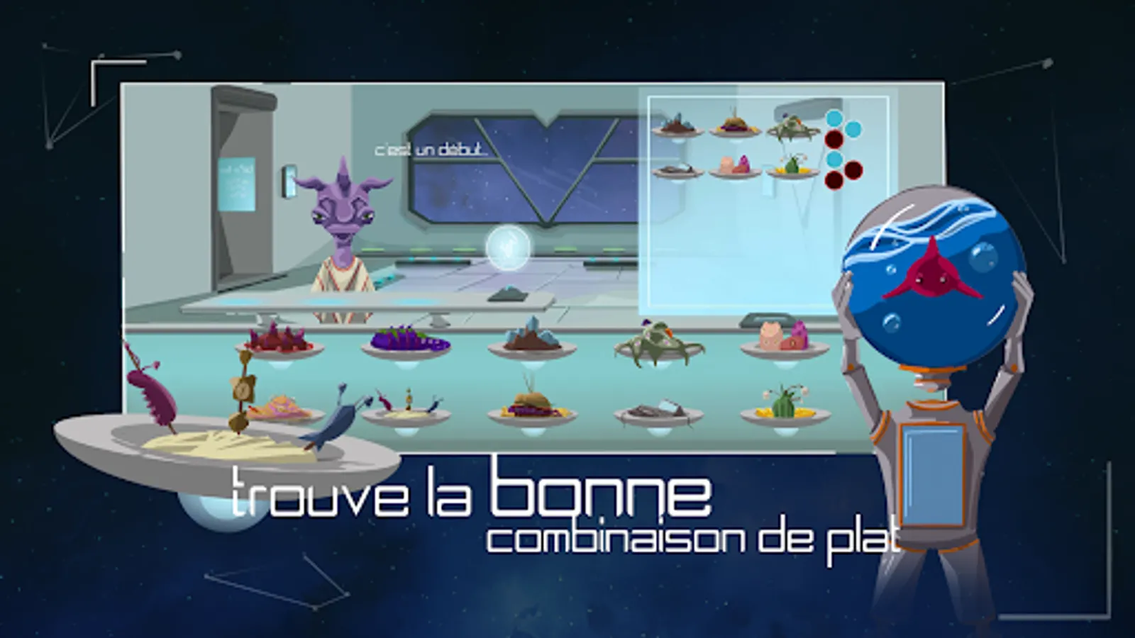 The goal of the Space Food game is to find the right combination of 3 dishes from a selection of around ten dishes. To do this, slide the dishes with your finger towards the plates of the aliens. On each try, the game indicates how many plates are good, how many plates are good but in the wrong place, and how many plates are bad.