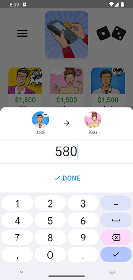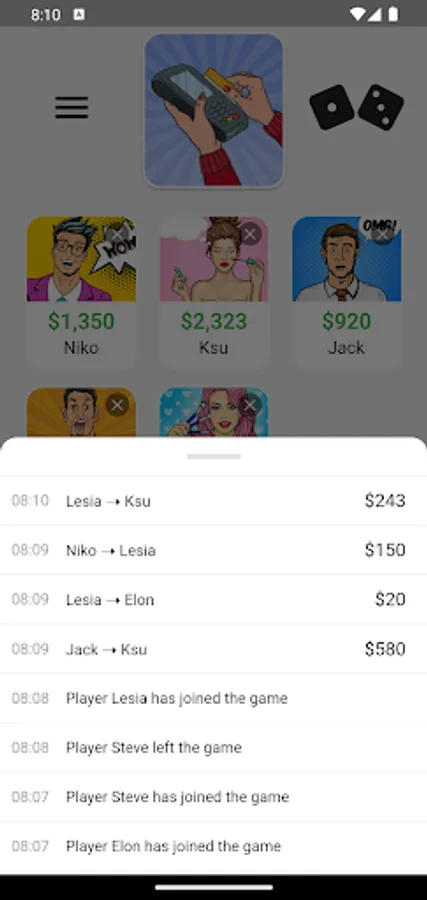 To transfer money to another player, simply drag your figure onto his figure with your finger and indicate the amount. The bank works the same way. To pay the bank, drag your piece to the bank field.