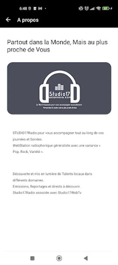 STUDIO17Radio to accompany you throughout your days and evenings. Generalist radio WebStation with a “Pop, Rock, Variety” variance. Discovery and highlighting of local talents in different fields. Emissions, reports and direct to discover.