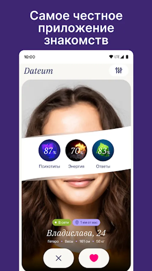 Dateum is an app that will help you find the perfect partner for a serious long-term relationship. It brings together people who are looking for a deep emotional connection and a coincidence of important qualities and values.