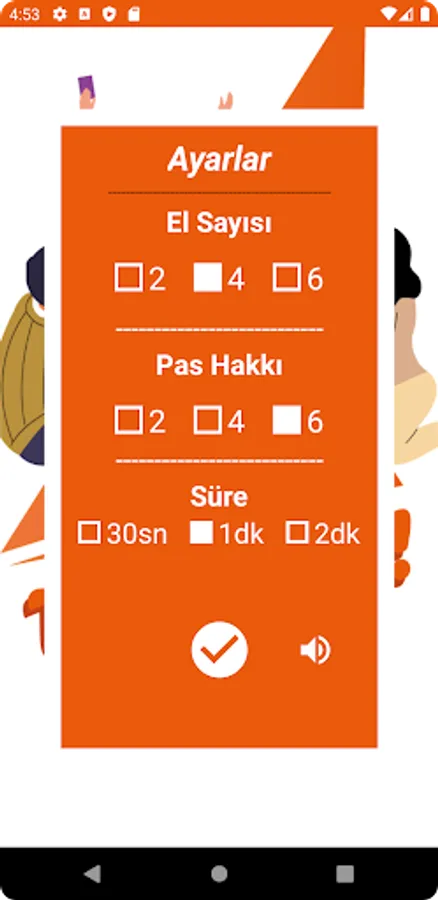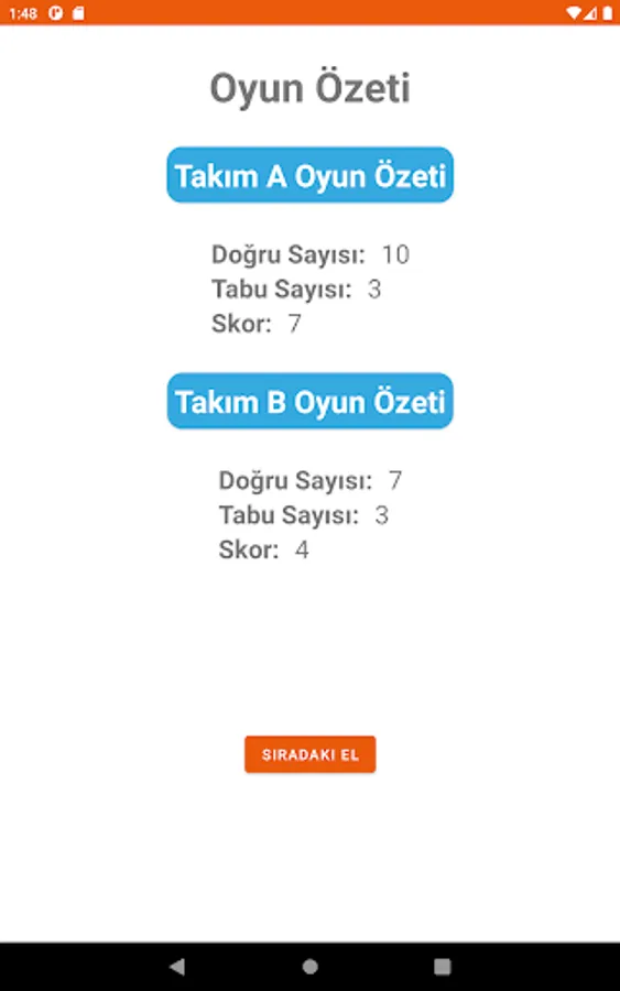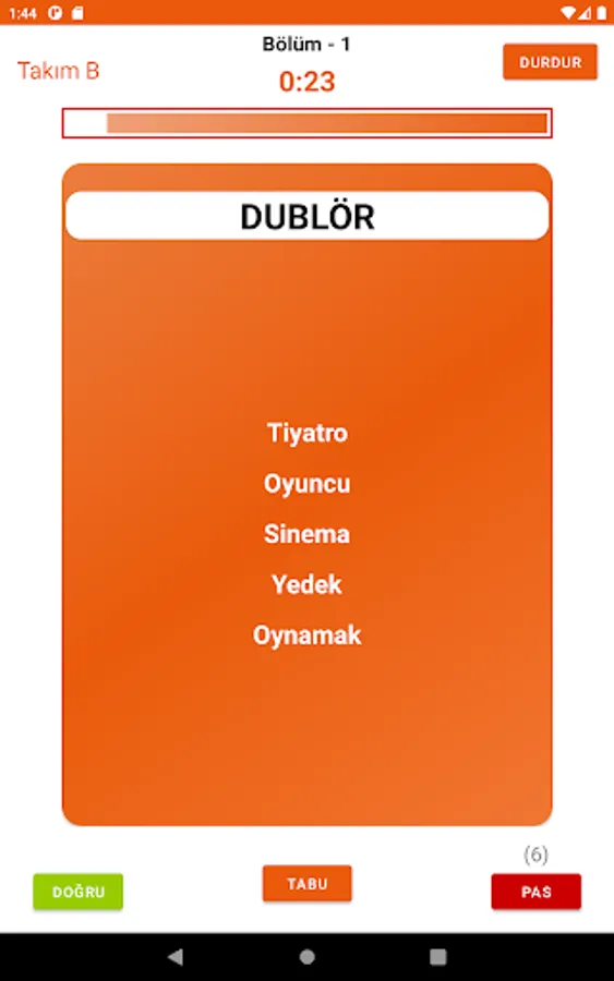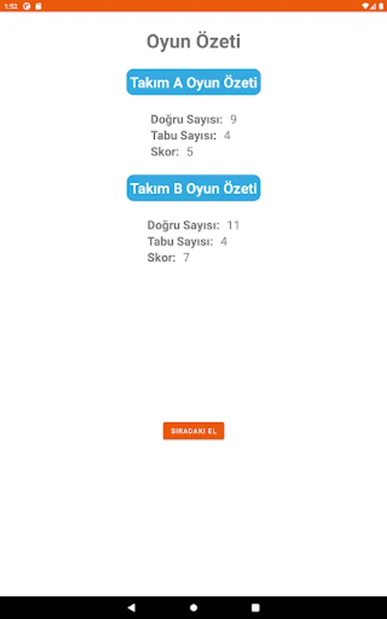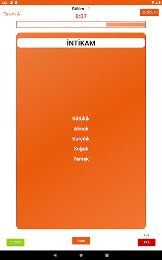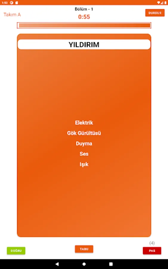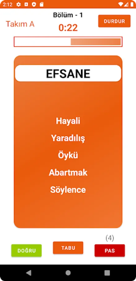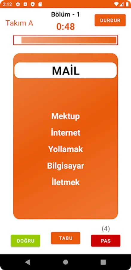 - If the narrator succeeds in getting his group to say the searched word, he should press the "correct" button, if he says one of the forbidden words, the "taboo" button, if he does not tell the word but wants to switch to a new word, he should press the "pass" button.