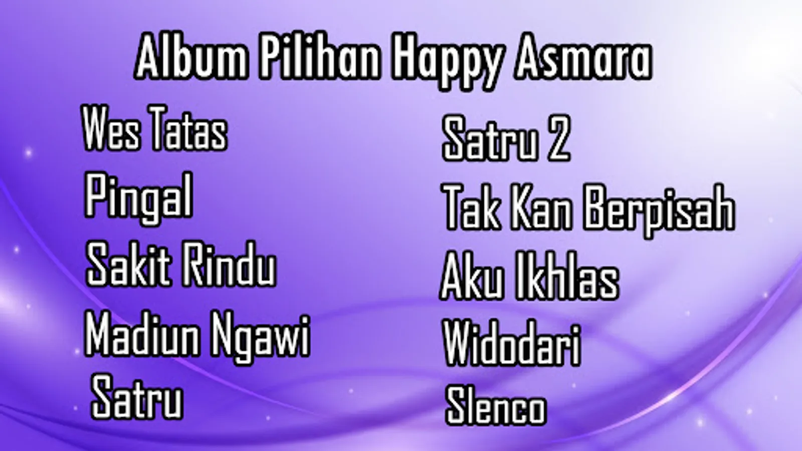The newest Happy Asmara Mp3 Offline Music Player application is made with a fresher look so it's easy to use everyday. The collection of Dangdut songs Happy Asmara Ft. Denny Caknan Offline is always updated with the latest Dangdut songs. Don't miss getting this Happy Asmara Complete Dangdut Koplo song. Immediately download and play the Complete Offline Happy Asmara Mp3 Application.
