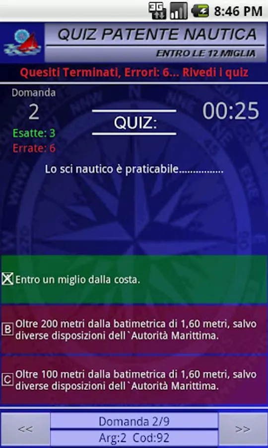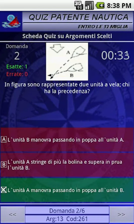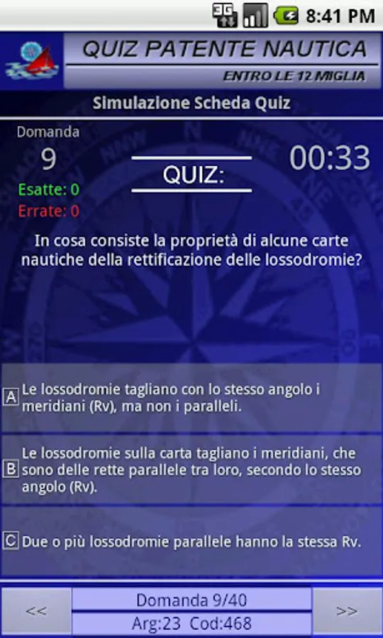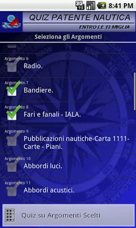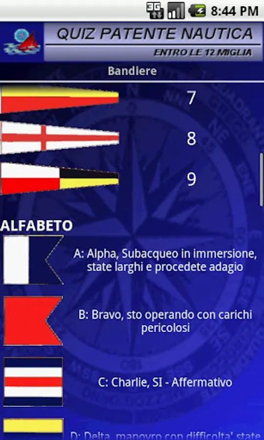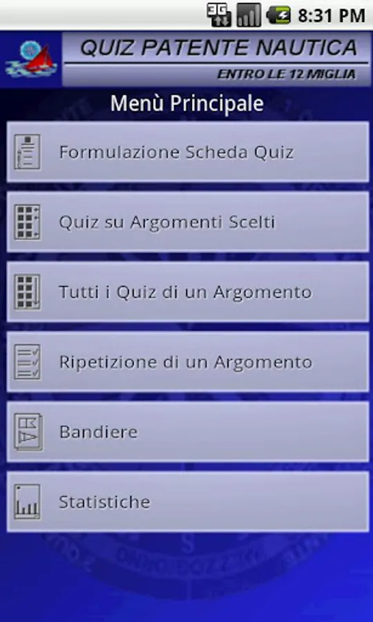 It allows practice in quiz for the achievement of the boat license within 12 miles with over 530 quiz divided by topic. It includes different operating modes to adapt better to the stages of learning. The handy function calculation and display of statistics of "correct answers / wrong", allows, for each topic, to have a quick feedback of any gaps and to use the integrated function "Repeat Topics" for display and study of all quizzes with their exact answers.