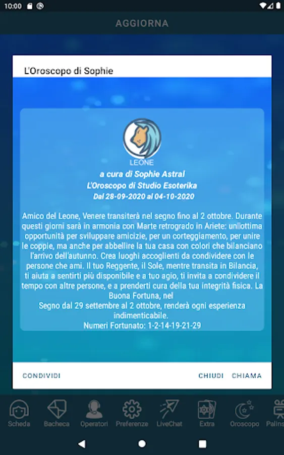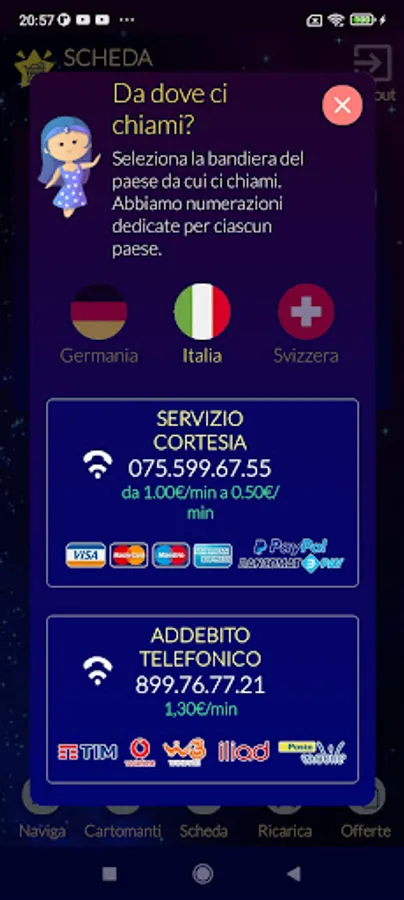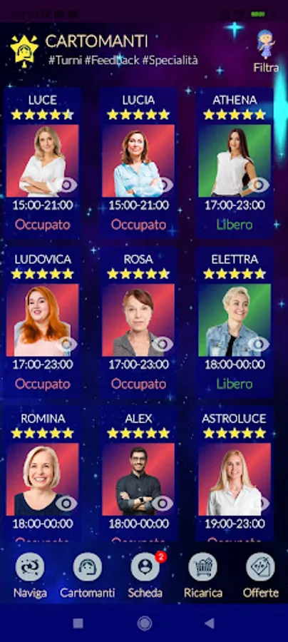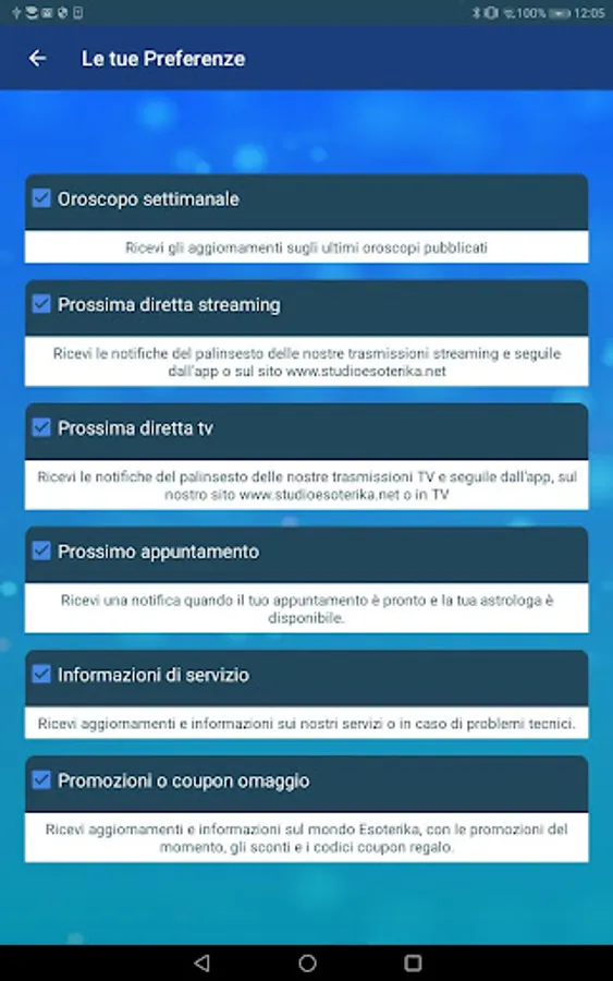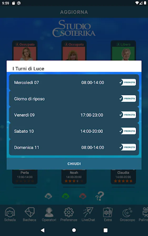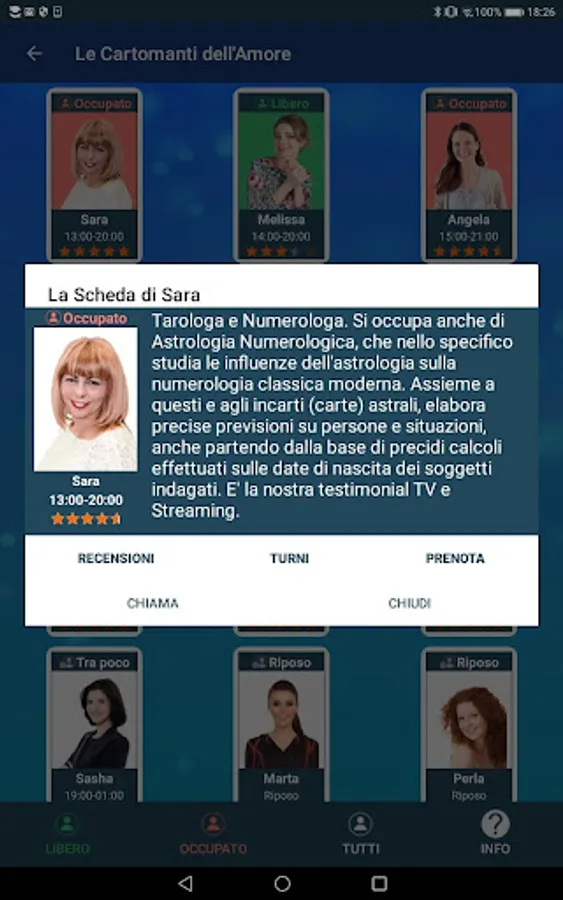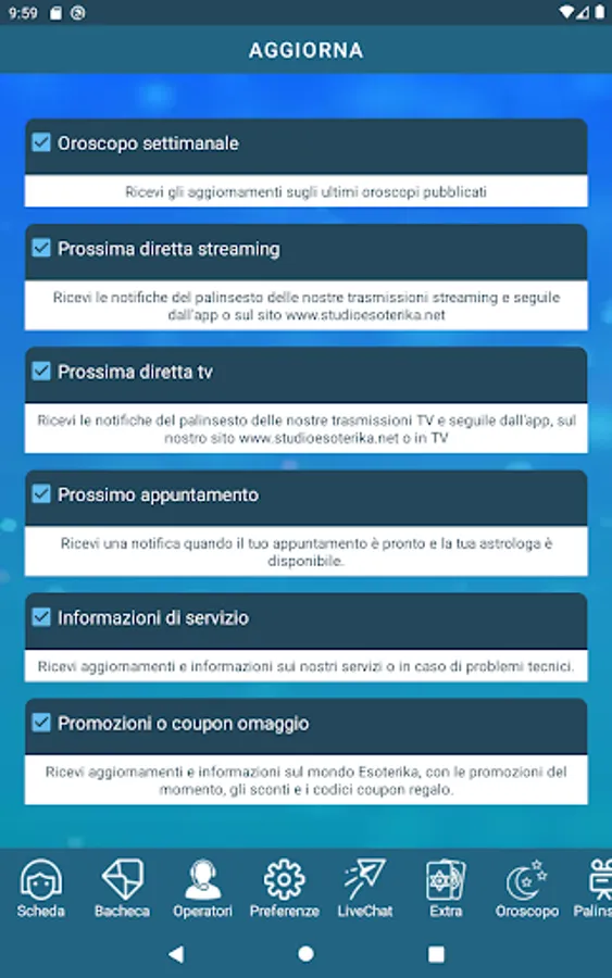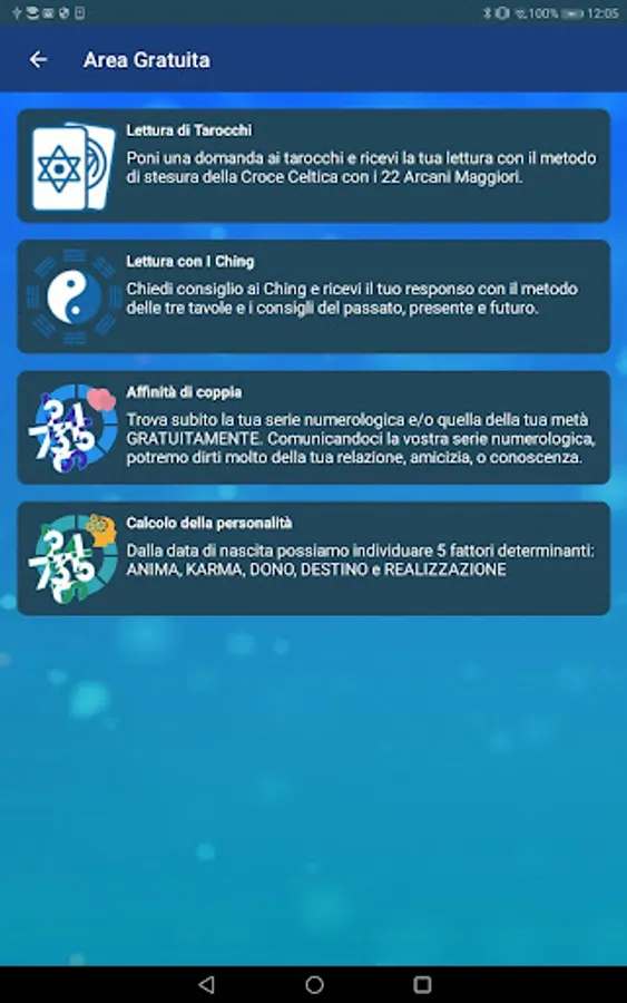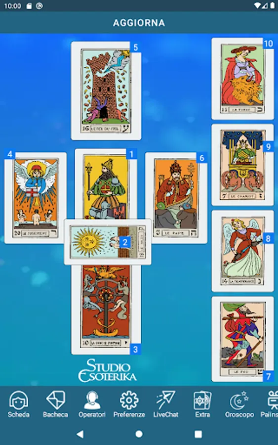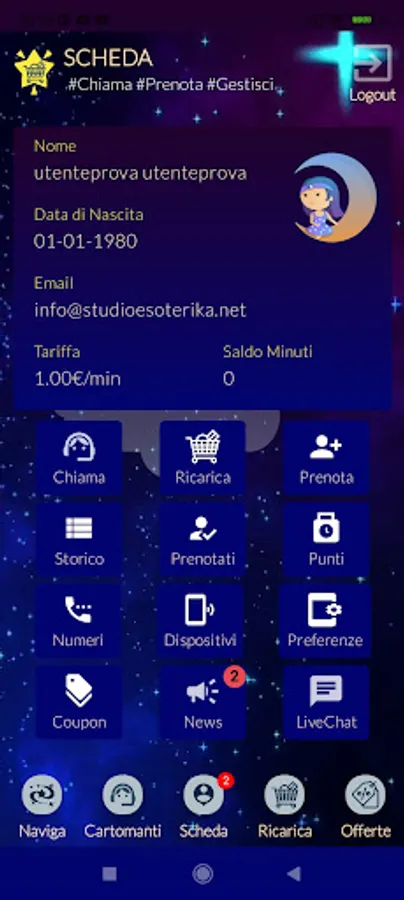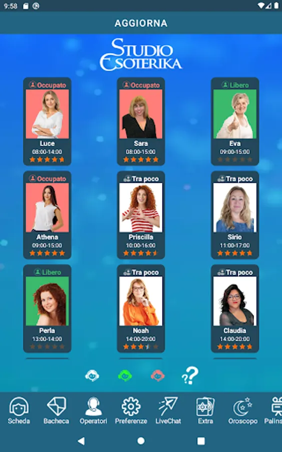 EsoterikApp is the official App of Studio Esoterika, one of the most famous centers of cartomancy, astrology and holistic sciences in Italy. With EsoterikApp you always carry Studio Esoterika with you. You have a reserved area to keep under control the history of the consultations you receive and the services requested, you can book consultations with your favorite fortune teller, buy minutes of conversation, leave feedback on the consultations received, follow the direct web of the testimonials of Studio Esoterika , receive a preview of the weekly Sophie Astral horoscope, receive discounts, giveaways, confidential promotions, free consultations and personality calculations, couple affinity analysis and much more.