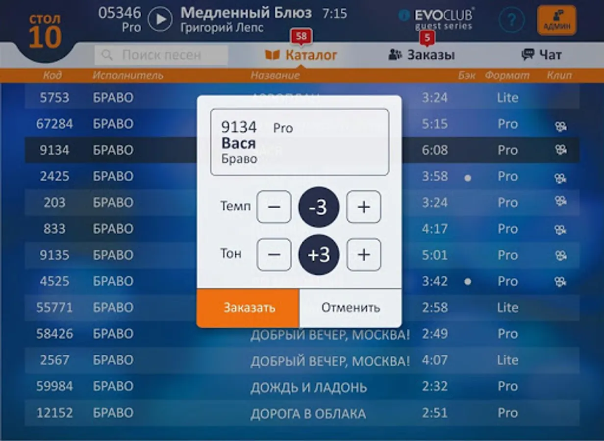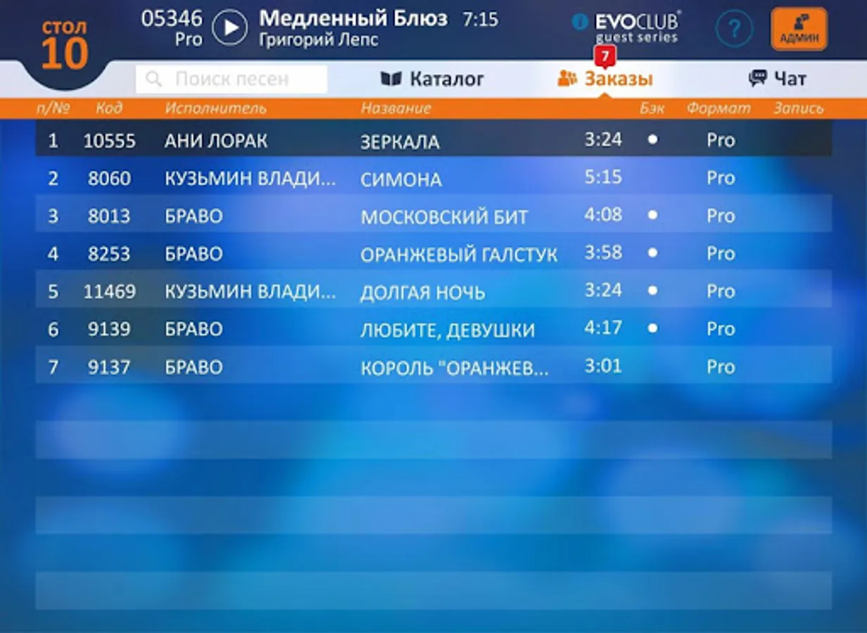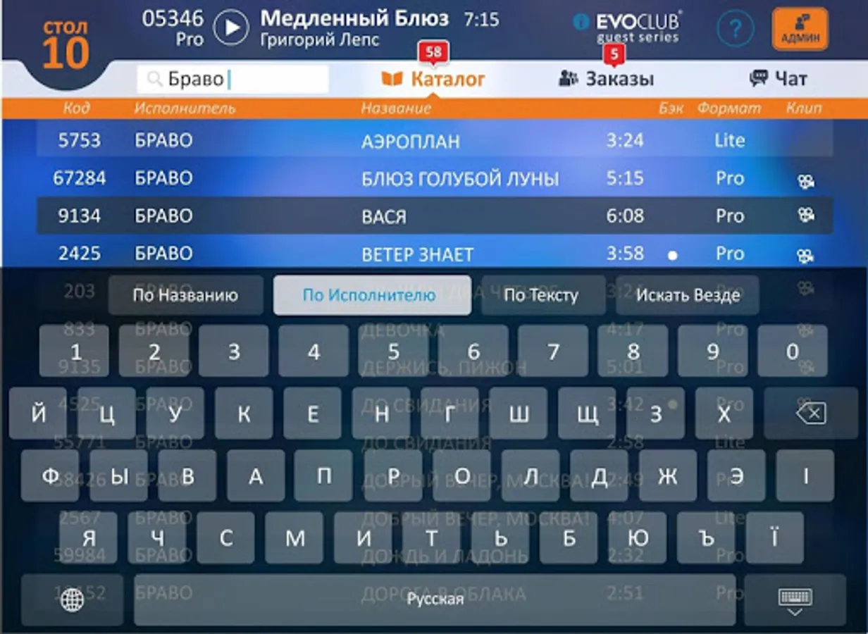 The “EvoClub Guest” module is installed on the tablets at the disposal of the guests of the karaoke club. The number of tablets is determined by the number of tables in the karaoke club (the program supports connecting up to 24 tablets / tables). With the help of “EvoClub Guest” guests of the club can carry out independent search and order of songs, as well as communicate in the internal chat of the karaoke club.
