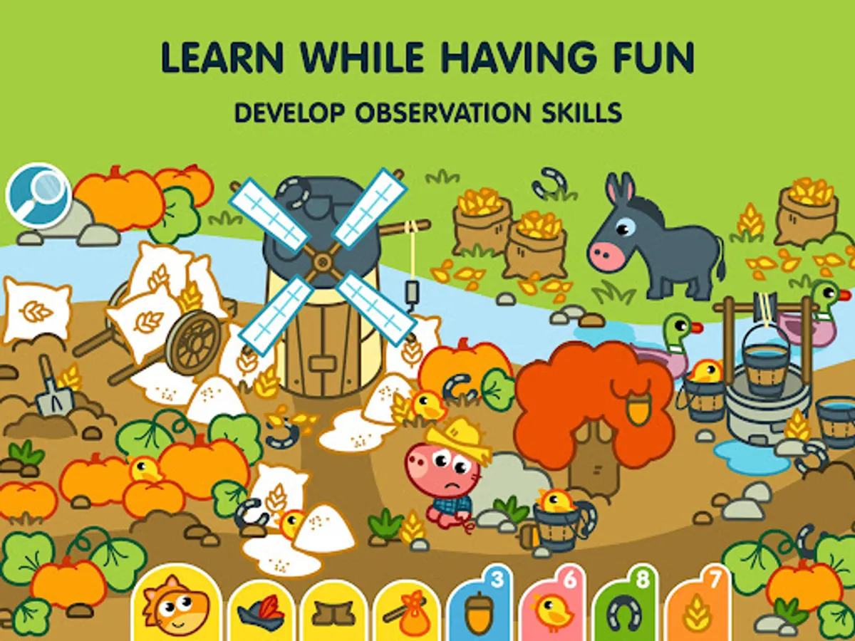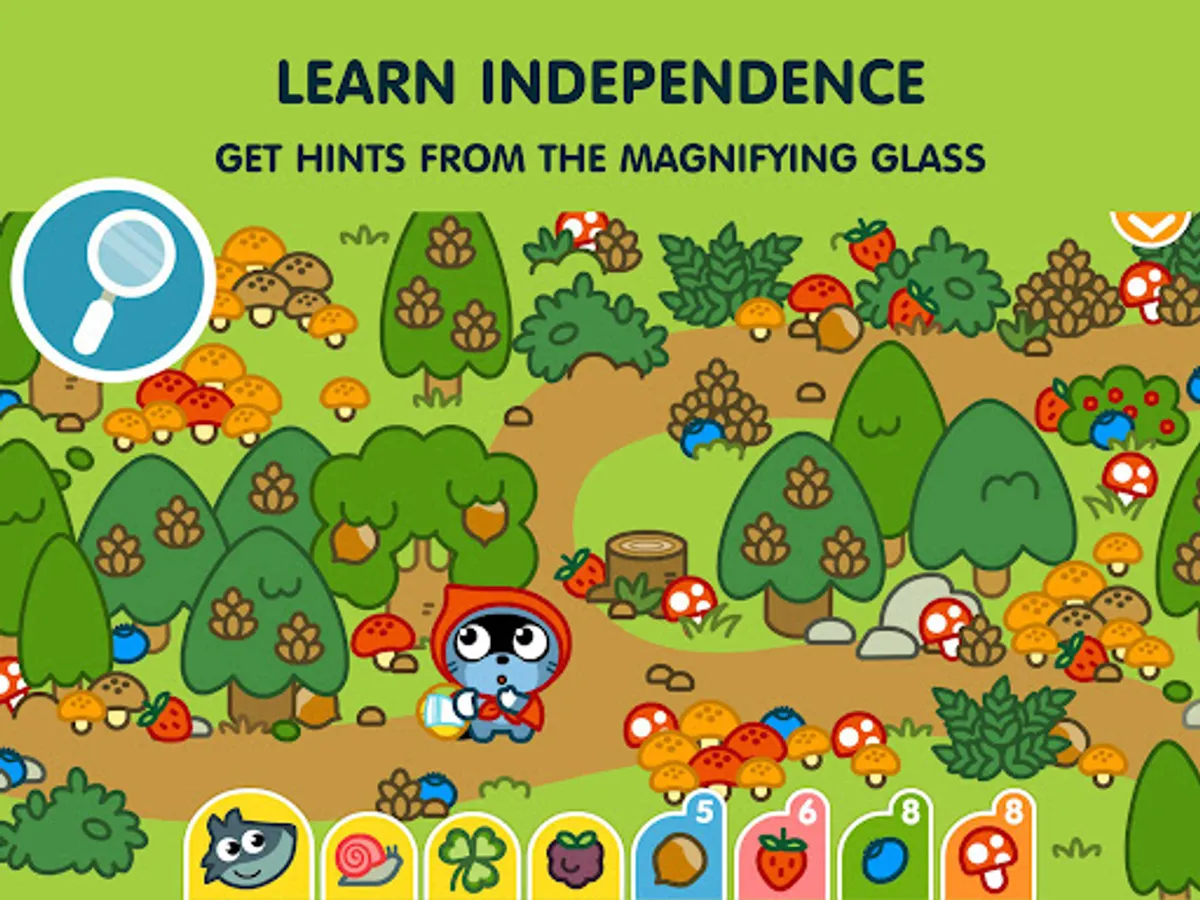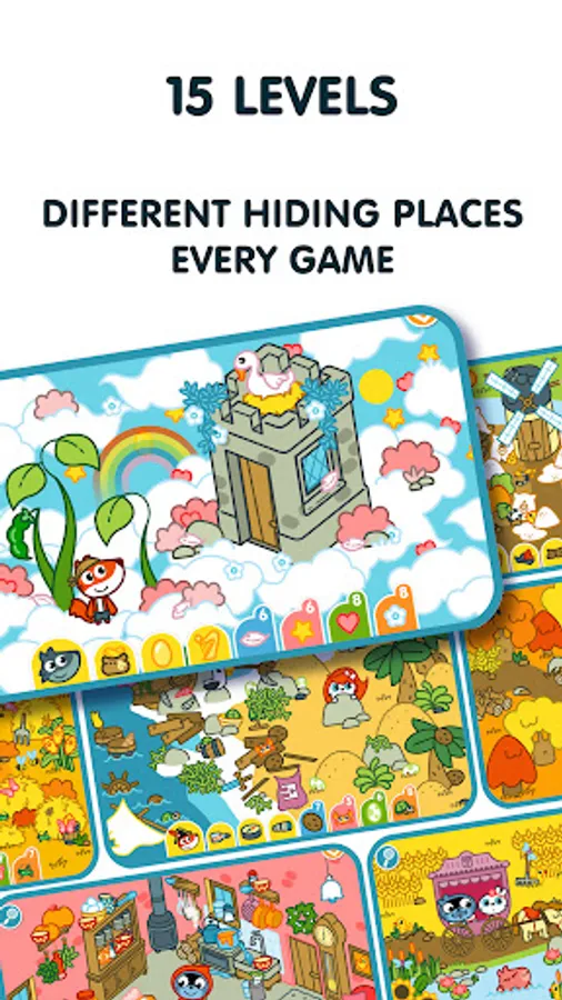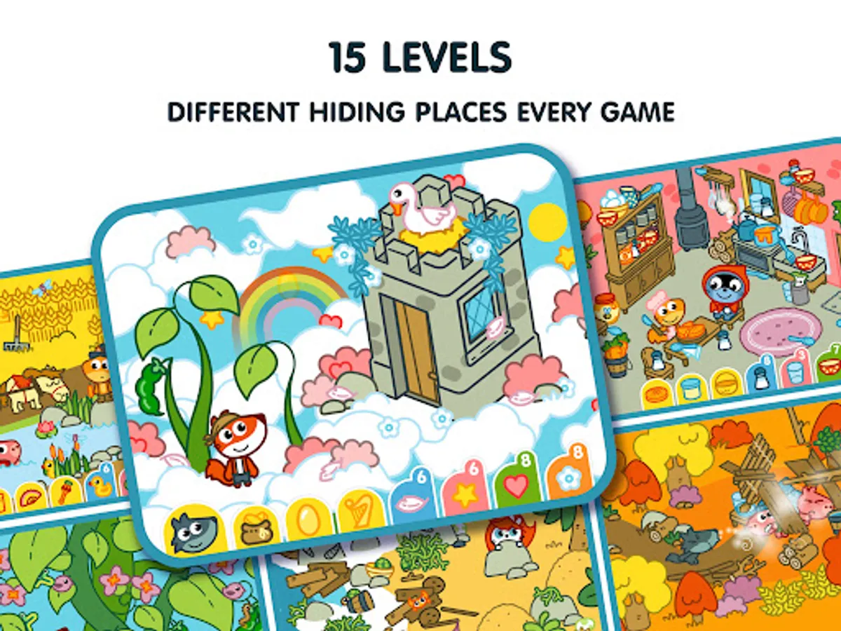 Seek and find characters and objects to advance the story across 15 pictures. Behind rocks, under tables, in trees... there are lots of places to hide! Explore and search the pictures with your fingers. Open, lift, clear... If you can't find something, use the magnifying glass for help.