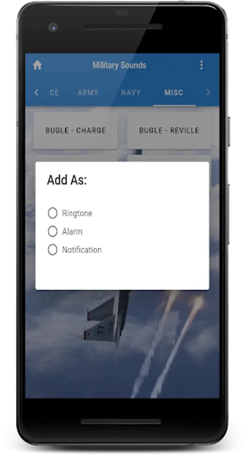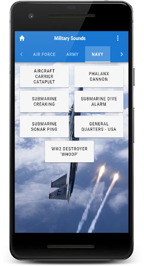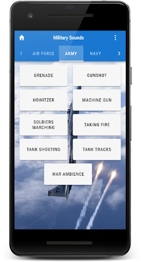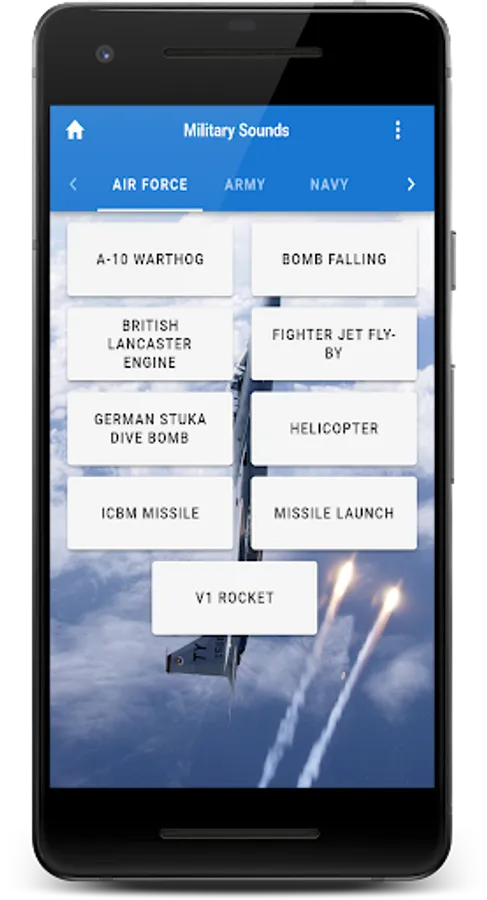 The Military soundboard is here! With over 30 sounds that you might hear while at war, in a movie, or even at an air show. These realistic sounds are as authentic as it gets. Better yet, why not make one of them your ringtone, alarm, or notification sound!