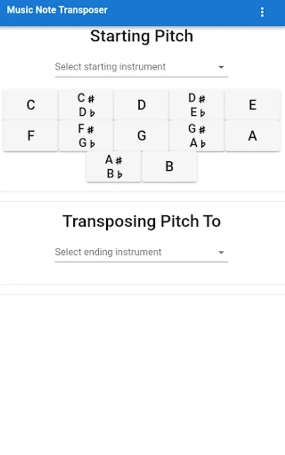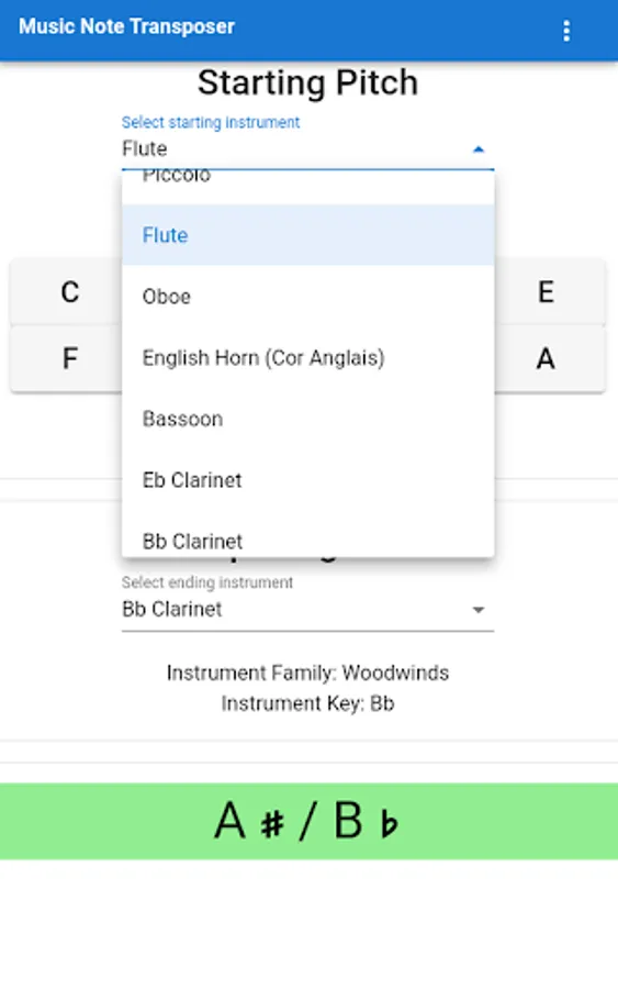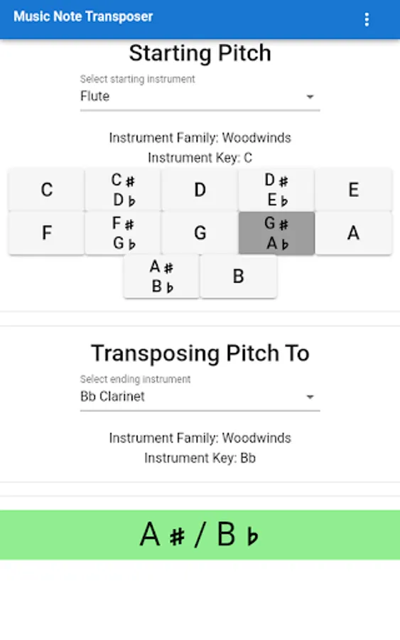 Just pick the starting instrument, select their note, and then select the instrument you want to transpose to. BAM! The resulting pitch will be displayed. That sure was easy!