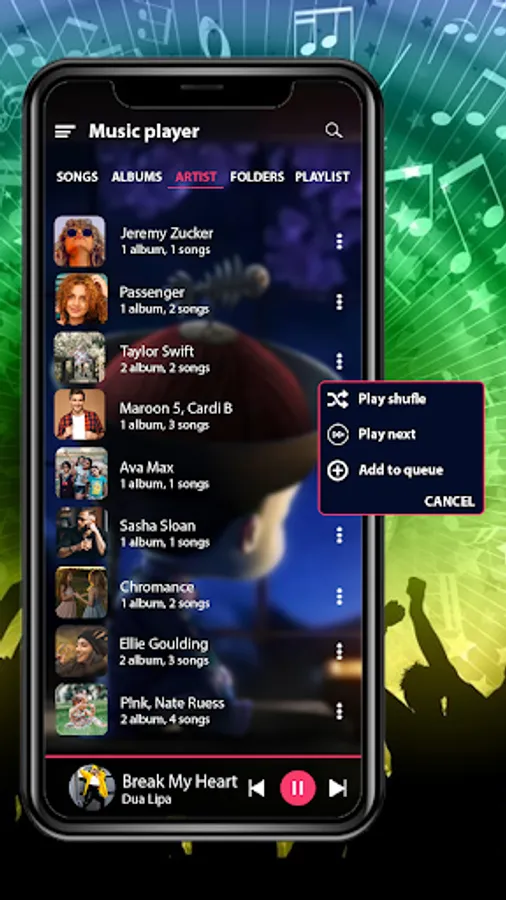 Music player allows you to manage all your audio files and play music files quickly and easily. You can easily browse and play music tracks, and create your own playlists.
