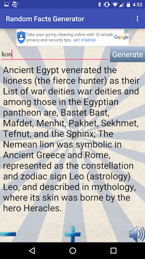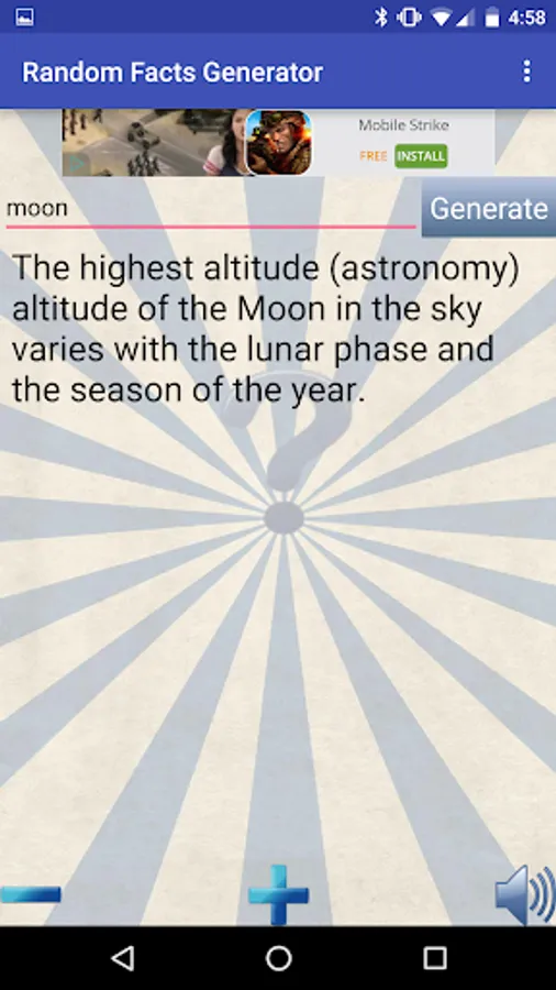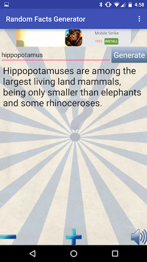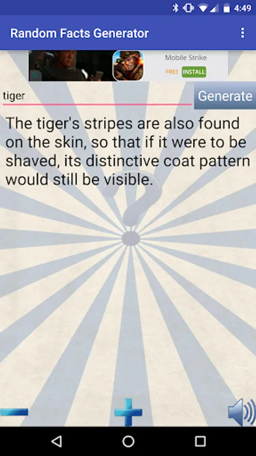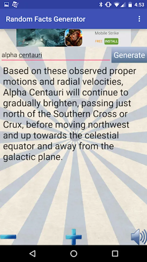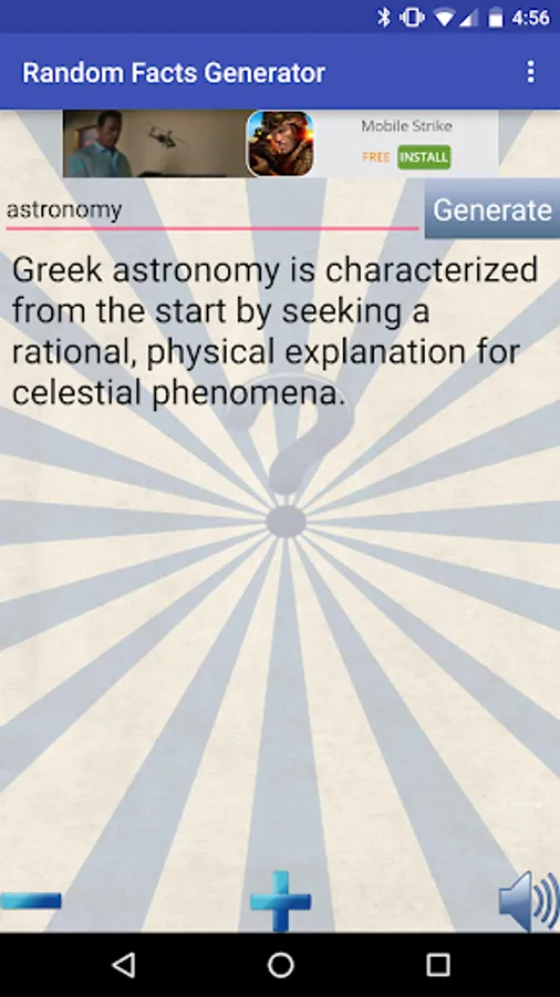 If you don't have time to look up and research a particular subject and just want to learn some quick facts about something, then this app is for you! If you have a lot of free time and want to learn some quick facts about something, then this app is for you too! Just enter a subject in the search field and Random Facts Generator will search the internet and look up some facts for you. Nice! It can even read the fact out for you out loud too! Go ahead and give it a go right now.