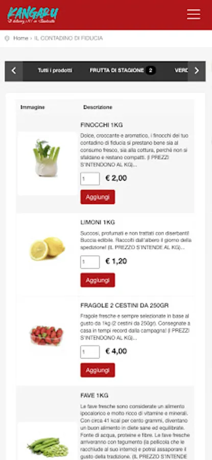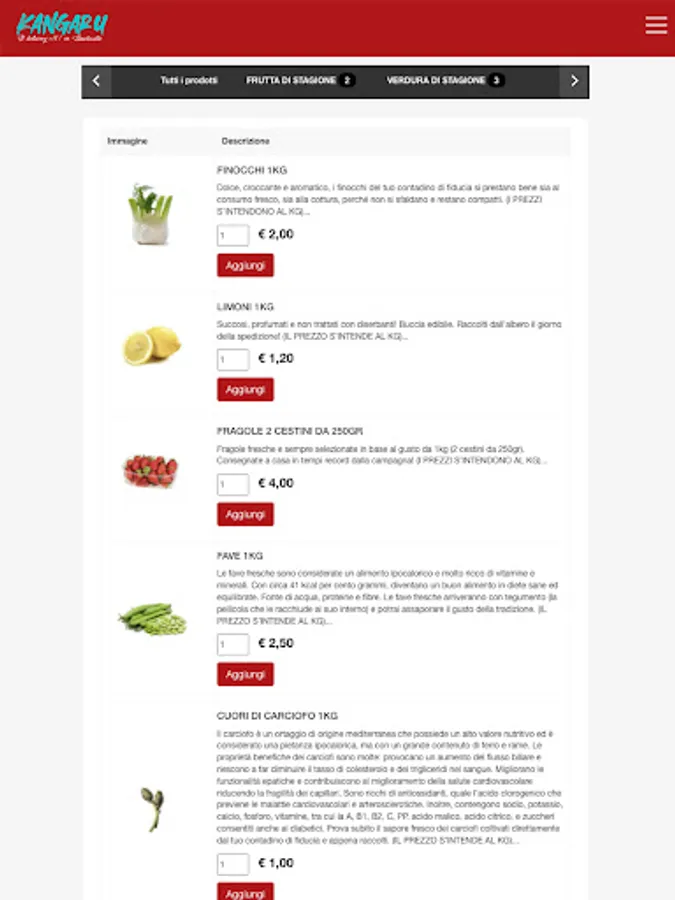 Also on Kangaru in the '' Fruits and Vegetables '' section you can order from the comfort of your home lush and fresh vegetables and fruits that are always and only in season.
