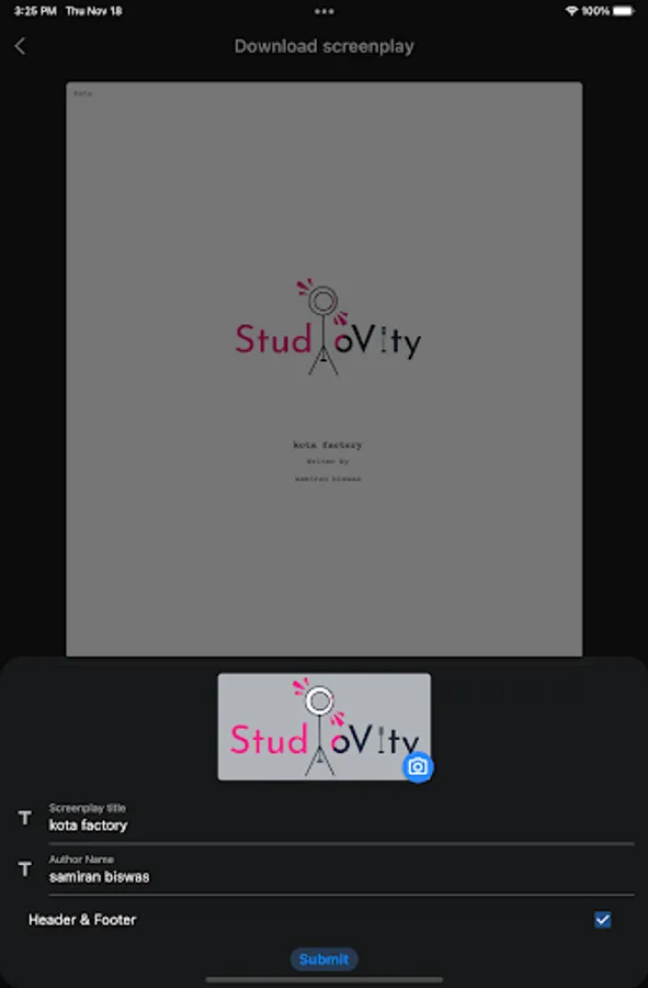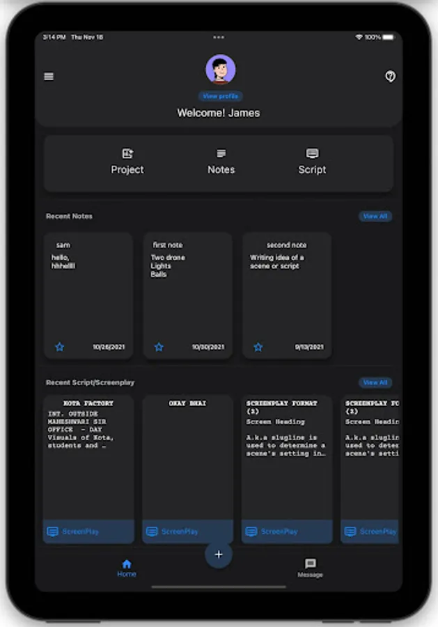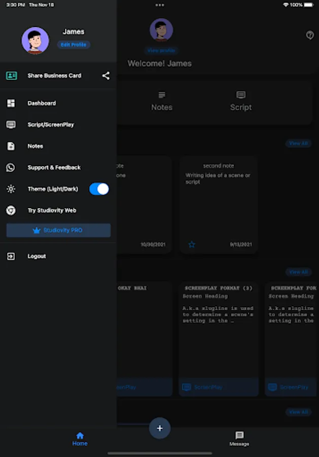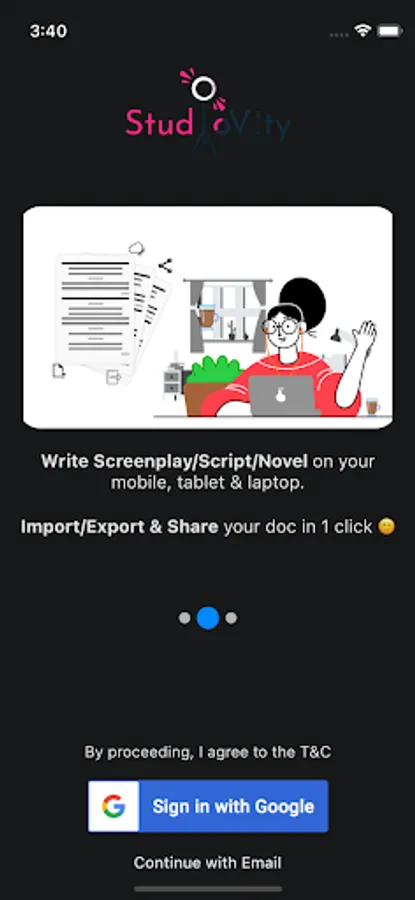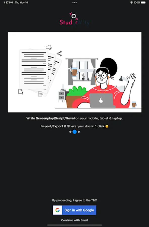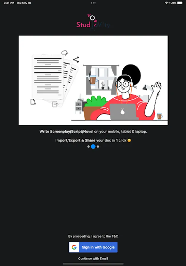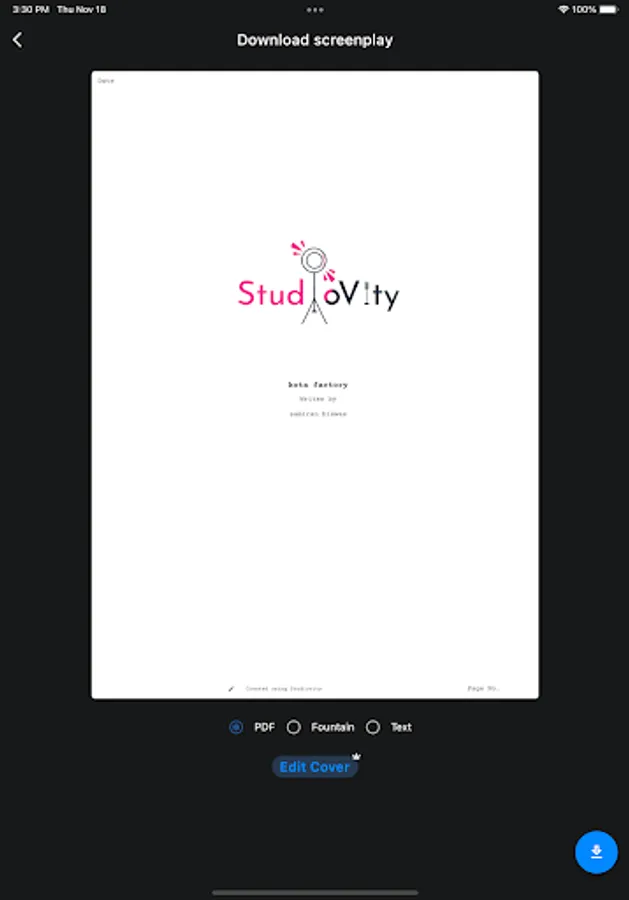 Experience modern UI/UX with the dark and light writers' focus themes on all devices. Outline and structure your film script with Index Card View, create a plot with 3 Act and 5 Act Structure using Beat Board, and add tagged notes for character and location descriptions. Collaborate with your team members in real-time and export your work in multiple formats like PDF, Text, Fountain, and Final Draft format. With Studiovity, you can write a formatted screenplay on your mobile device and the web, and sync it with your project every time you save.