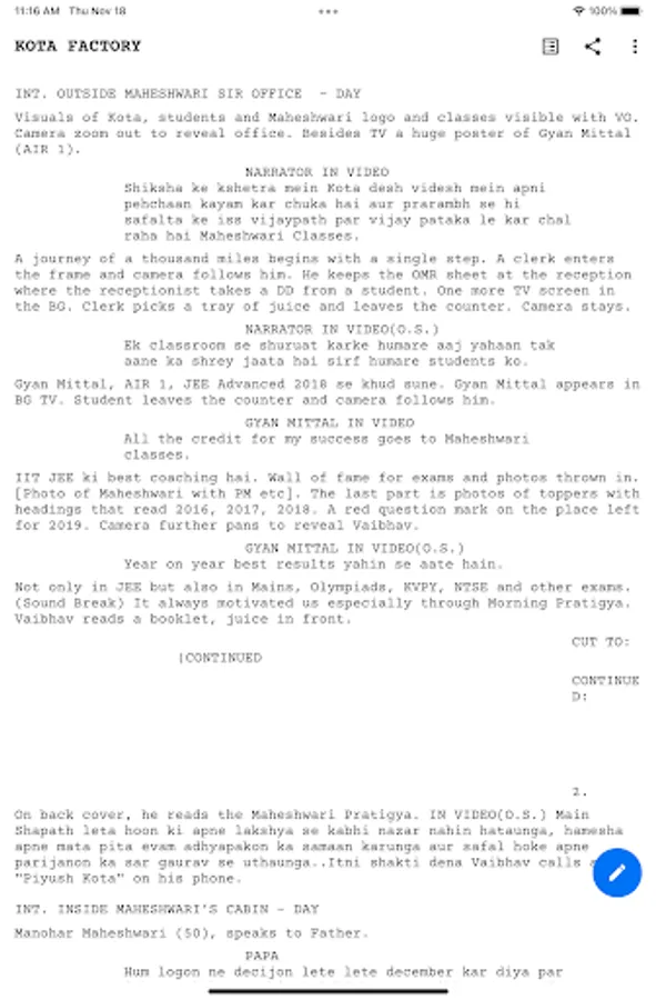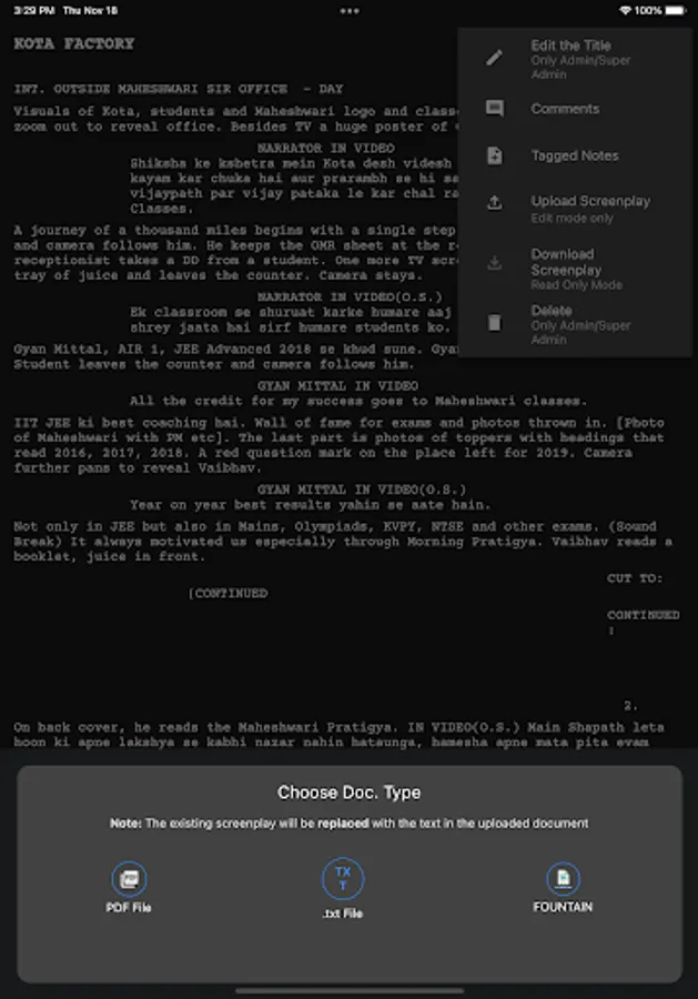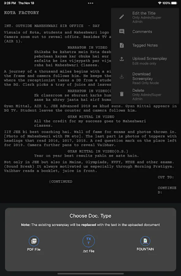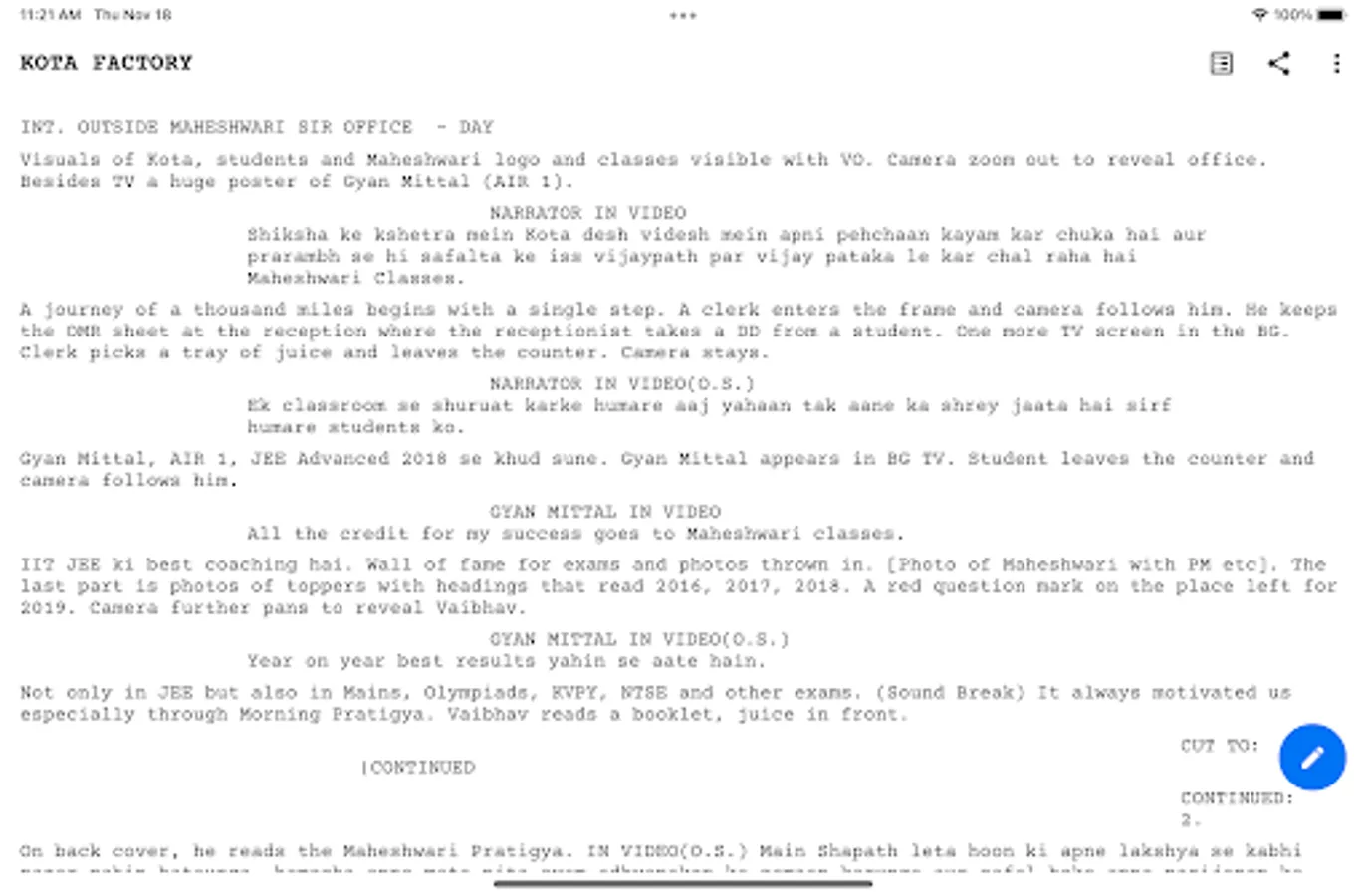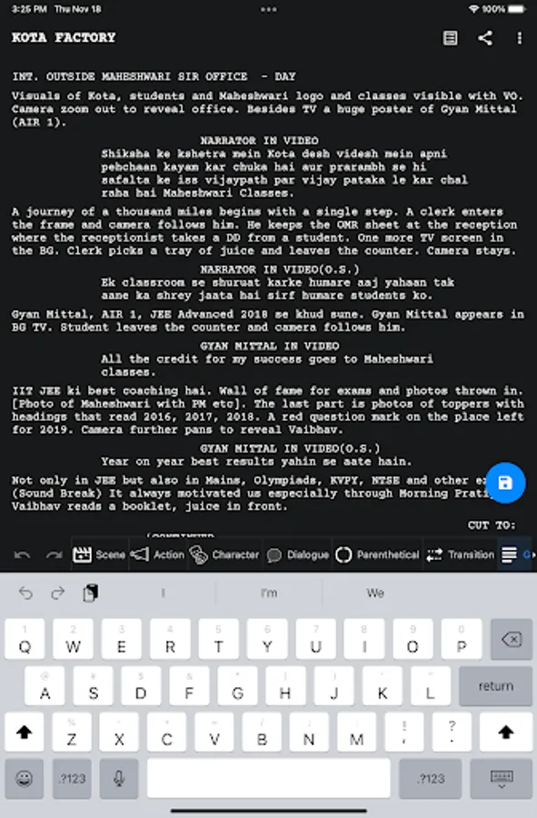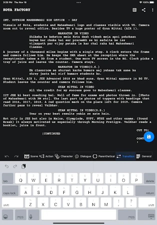 Experience modern UI/UX with the dark and light writers' focus themes on all devices. Outline and structure your film script with Index Card View, create a plot with 3 Act and 5 Act Structure using Beat Board, and add tagged notes for character and location descriptions. Collaborate with your team members in real-time and export your work in multiple formats like PDF, Text, Fountain, and Final Draft format. With Studiovity, you can write a formatted screenplay on your mobile device and the web, and sync it with your project every time you save.