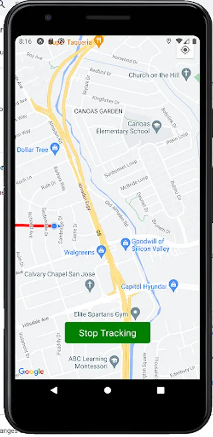 When you press the "Start tracking" button, the app tracks where you are running and draws a snail trail after you, so you can keep track of where you have been.