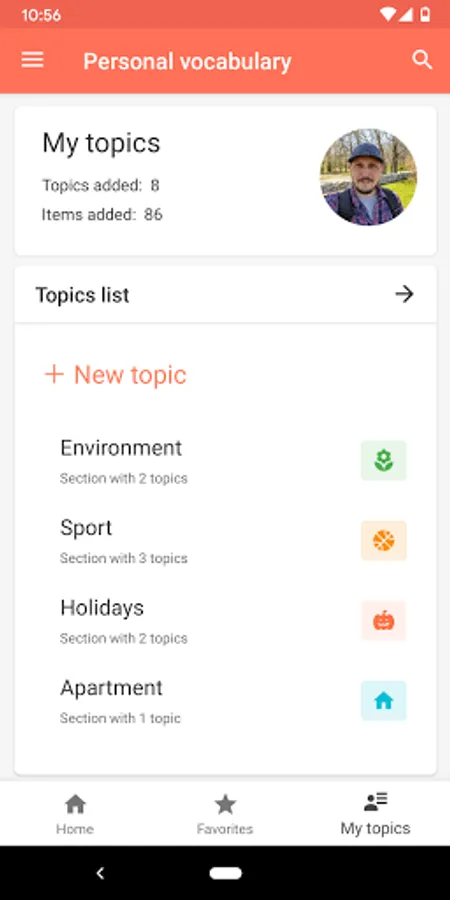 - You can learn ready-made vocabulary topics or create your own sets of words or phrases.