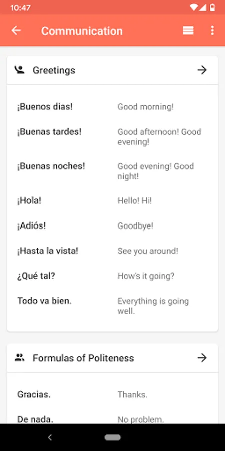 Here you can find the most important and common Spanish words and phrases for various topics: Greetings, People, Communication, Transport, City, Travel, Health, Shopping, Food, Signboards, Numbers etc.