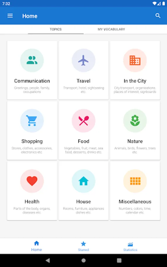 - You can learn ready-made vocabulary topics or create your own sets of words or phrases.