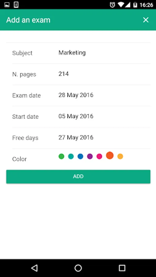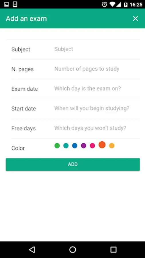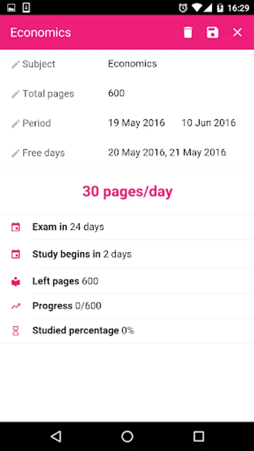 Organize your study and track down your exams in a smart way! Set key data like starting date, exam date, free days. The app will calculate the daily amount of study and track your progress, with daily updating. Every record once inserted, can be updated, deleted through dedicated forms and views.