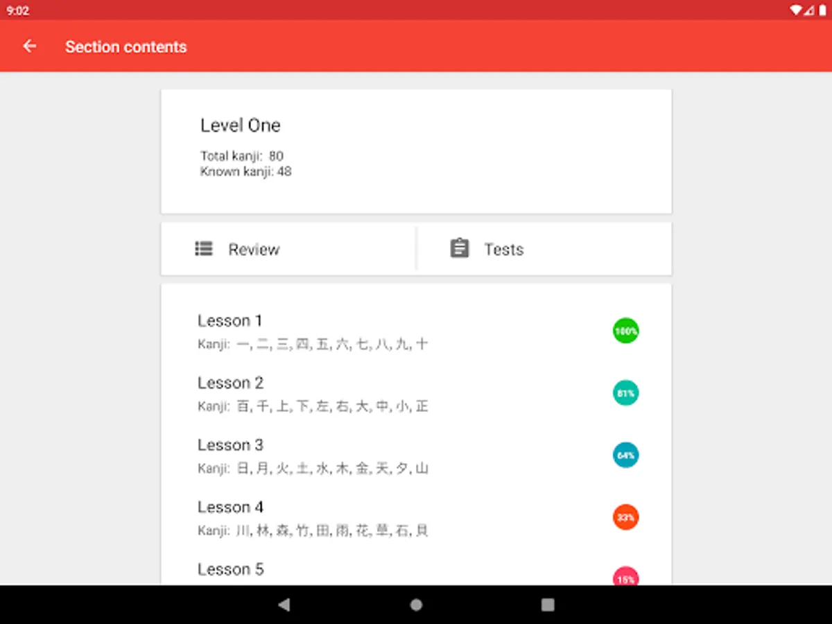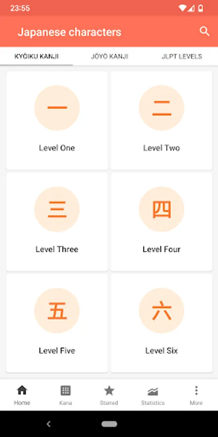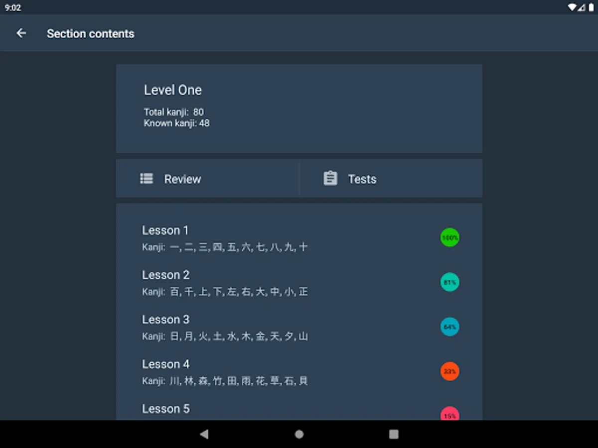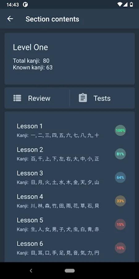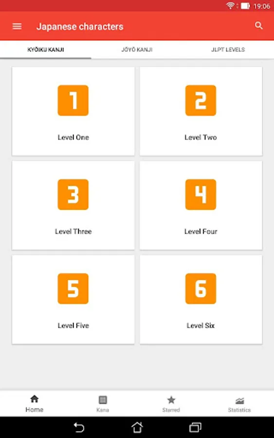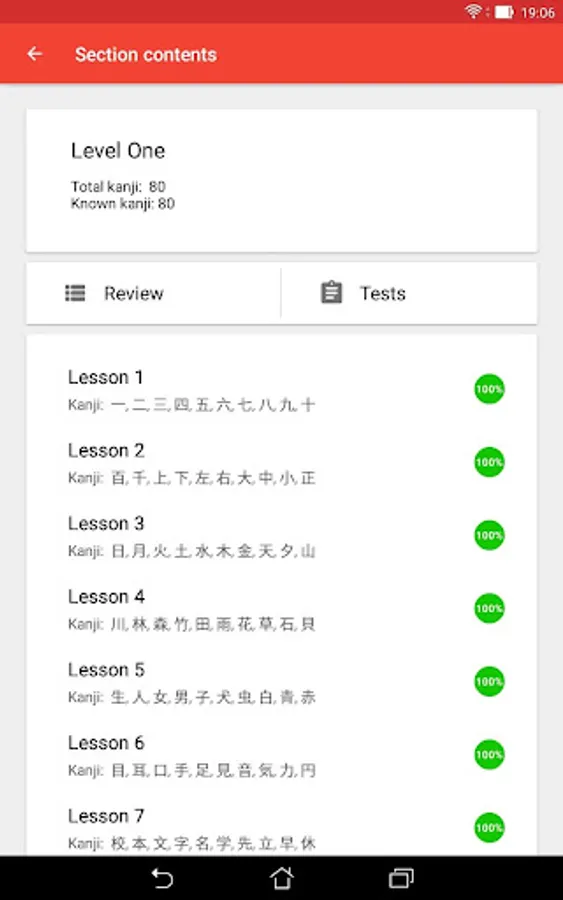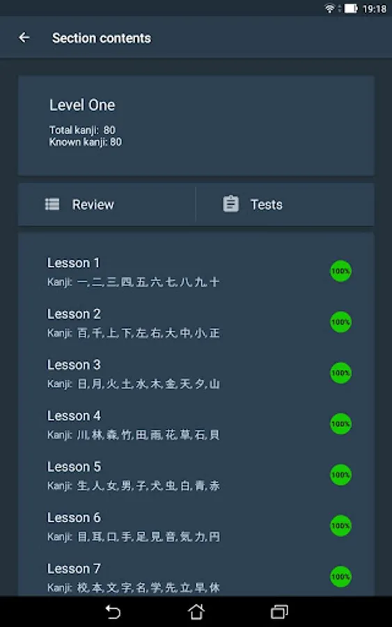 To make learning kanji more comfortable, the list is divided into six levels according to Japanese school grades. Every level has lessons that generally contain 10 characters and include 3 parts: characters listing, exercises and revision.